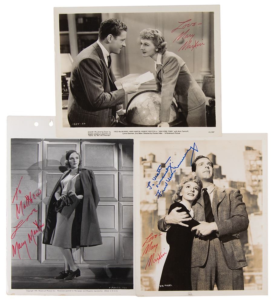 Three glossy photos of Mary Martin related to the 1941 film New York Town: an 8 x 10 studio photo of Martin with costar Fred MacMurray, signed in red felt tip, "Love--Mary Martin," and in blue felt tip, "To Matt--sincerely, Fred MacMurray"; a 10 x 8 Paramount Pictures publicity photo of Martin with Robert Preston, signed in red felt tip, "Love, Mary Martin"; and a double-weight 8 x 11 publicity photo of Martin dressed in a chicly conservative outfit, signed and inscribed in red felt tip, "To Matthew, Love, Mary Martin." In overall fine condition, with light wear and creases to borders, and punch holes to the top of the largest photo.