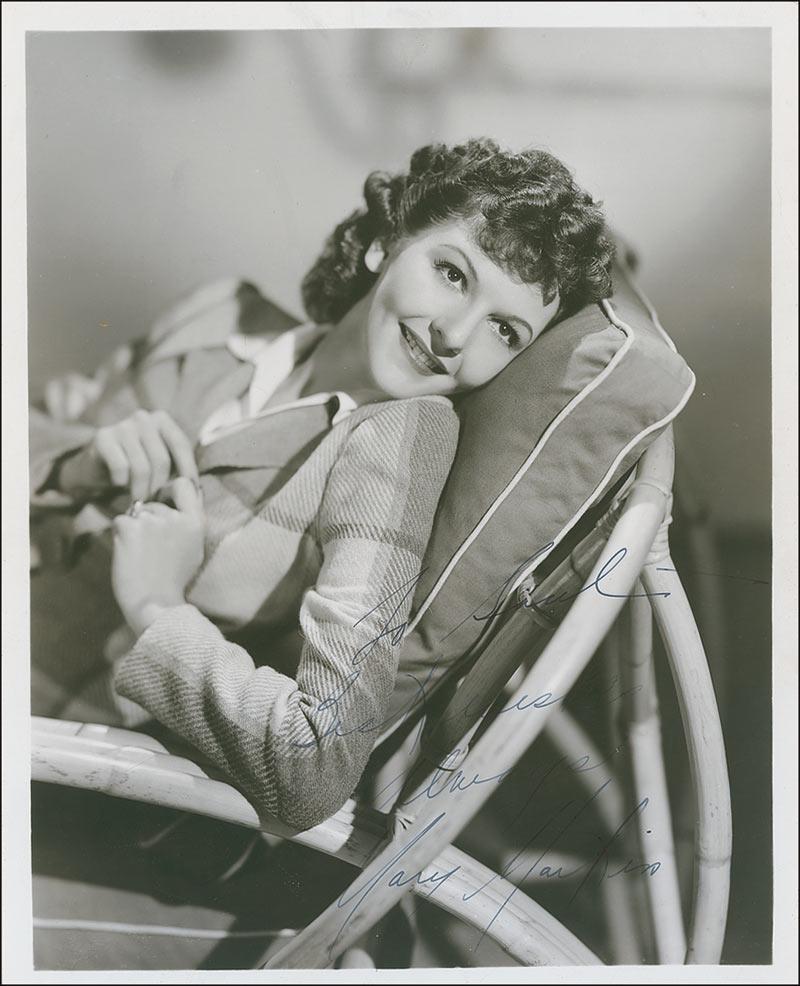 Vintage matte-finish 8 x 10 photo, signed and inscribed in-person in fountain pen “To Saul, Best wishes always, Mary Martin.” Reverse of photo bears collector’s stamp date of August 12, 1940, the date the signature was acquired. In fine condition, with light to moderate contrast to portions of signature and inscription. Saul Goodman Collection.
