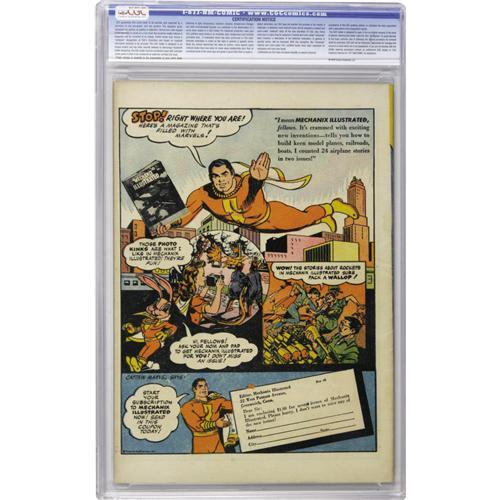 <B>Mary Marvel Comics #1 (Fawcett, 1945) CGC VF+ 8.5 Off-white pages.</B></I> After starring in <B>Wow Comics</B></I>, Mary Marvel earned her own title, and not only did she have Captain Marvel introduce her on the cover, she got her very own archfoe in Georgia Sivana (daughter of Dr. Sivana), whose first appearance and origin are in these pages. The cover art is by Jack Binder. CGC notes, "Very minor amount of color touch on cover." Overstreet 2006 VF 8.0 value = $1,319; VF/NM 9.0 value = $2,085. CGC census 10/06: 3 in 8.5, 6 higher.<BR><BR><b>Shipping:</b> Slabbed Comic (<a target="_blank" href="http://www.heritageauctions.com/common/shipping.php">view shipping information</a>)