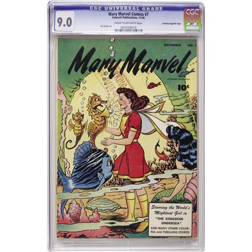 <B>Mary Marvel Comics #7 Crowley Copy/File Copy (Fawcett, 1946) CGC VF/NM 9.0 Cream to off-white pages.</B></I> Jack Binder art. Checking Copy stamp on cover. Overstreet 2006 VF/NM 9.0 value = $361; NM- 9.2 value = $485. CGC census 10/06: 2 in 9.0, 1 higher.<BR><BR><b>Shipping:</b> Slabbed Comic (<a target="_blank" href="http://www.heritageauctions.com/common/shipping.php">view shipping information</a>)