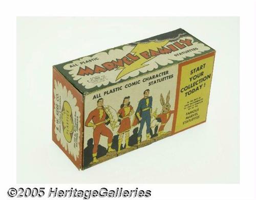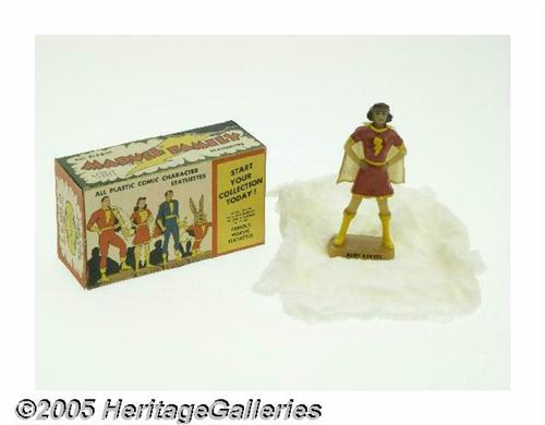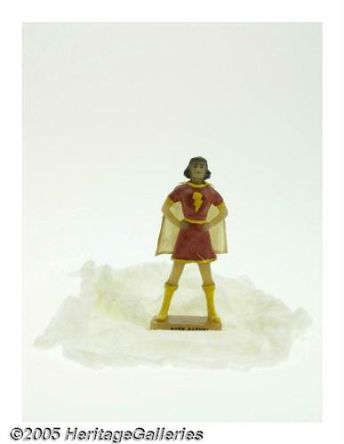 <B>Mary Marvel Statuette (Kerr Co., 1946) Condition: NM.</B></I> This lovely Mary Marvel statuette with its original box was one of a set of four "All Plastic Marvel Family Statuettes" produced in 1946 which consisted of Captain Marvel, Captain Marvel Jr., Mary Marvel and Hoppy the Marvel Bunny. This painted solid plastic figure includes Mary's name on the front of the base and copyright Fawcett Publications Inc. on back. A fabulous C.C. Beck-designed box features a scene on one panel of Captain Marvel holding the Mary Marvel statue while one other panel depicts all four statuettes. The box measures 4" x 7" x 2.5", and the statuette measures 1.5" x 2.5" x 6.25" tall. There appears to be some repair work to the ultra-delicate plastic cape, near the collar. There are probably less than 20 of these Mary Marvel statuettes in existence -- don't miss this rare opportunity to own one!