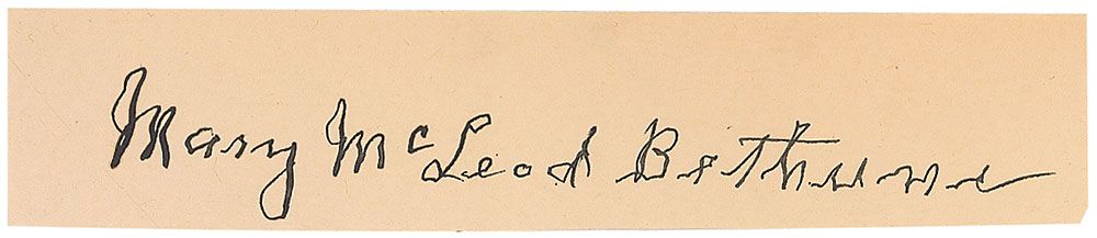Educator and civil rights leader (1875–1955) best known for starting a school for African-American students in Florida, that eventually became Bethune-Cookman University. Ink signature, “Mary McLeod Bethune,” on an off-white 6.25 x 1.25 slip clipped from a guest book. In fine condition.