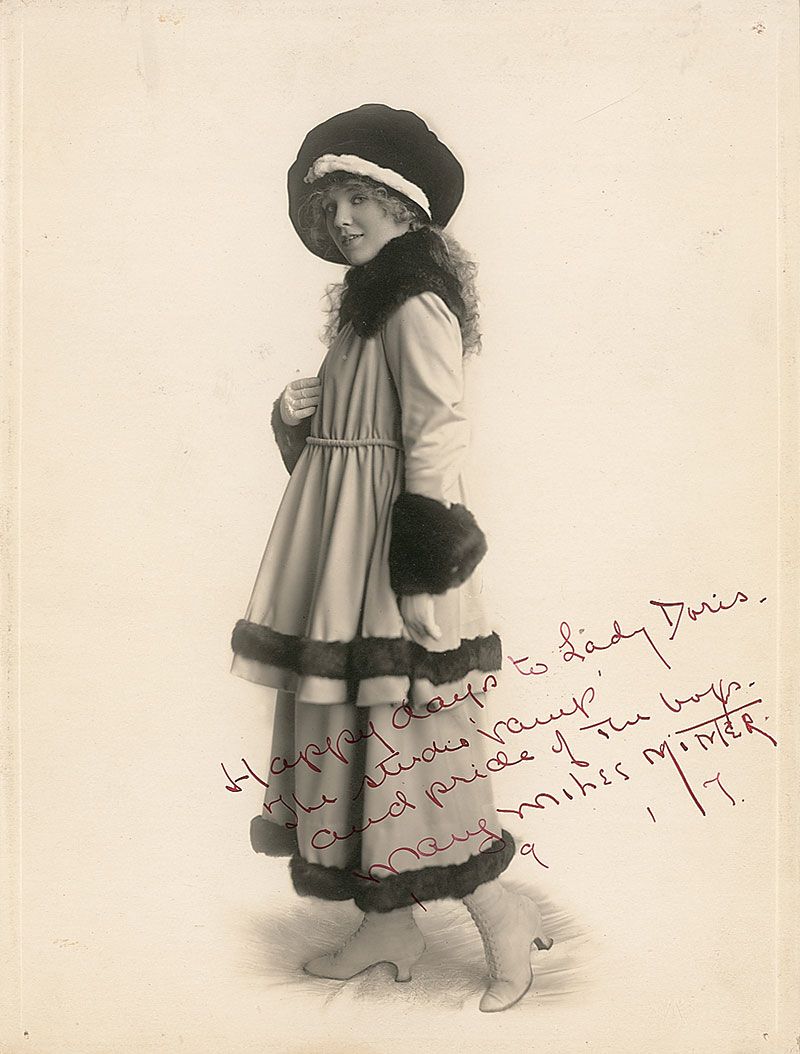Silent-era film actress (1902–1984) whose career suffered a fatal blow in 1922 with the unsolved murder of her sometime-director and reputed lover William Desmond Taylor. Following her final screen appearance in 1923, she lived as a recluse in California until the end of her life. Cute vintage matte-finish 7 x 9.5 full-length photo of Minter in a winter coat and matching hat, signed and inscribed in red fountain pen, “Happy days to Lady Doris, the studio ‘vamp’ and pride of the boys. Mary Miles Minter, 1917.” In fine condition, with a single tack hole to each corner.
