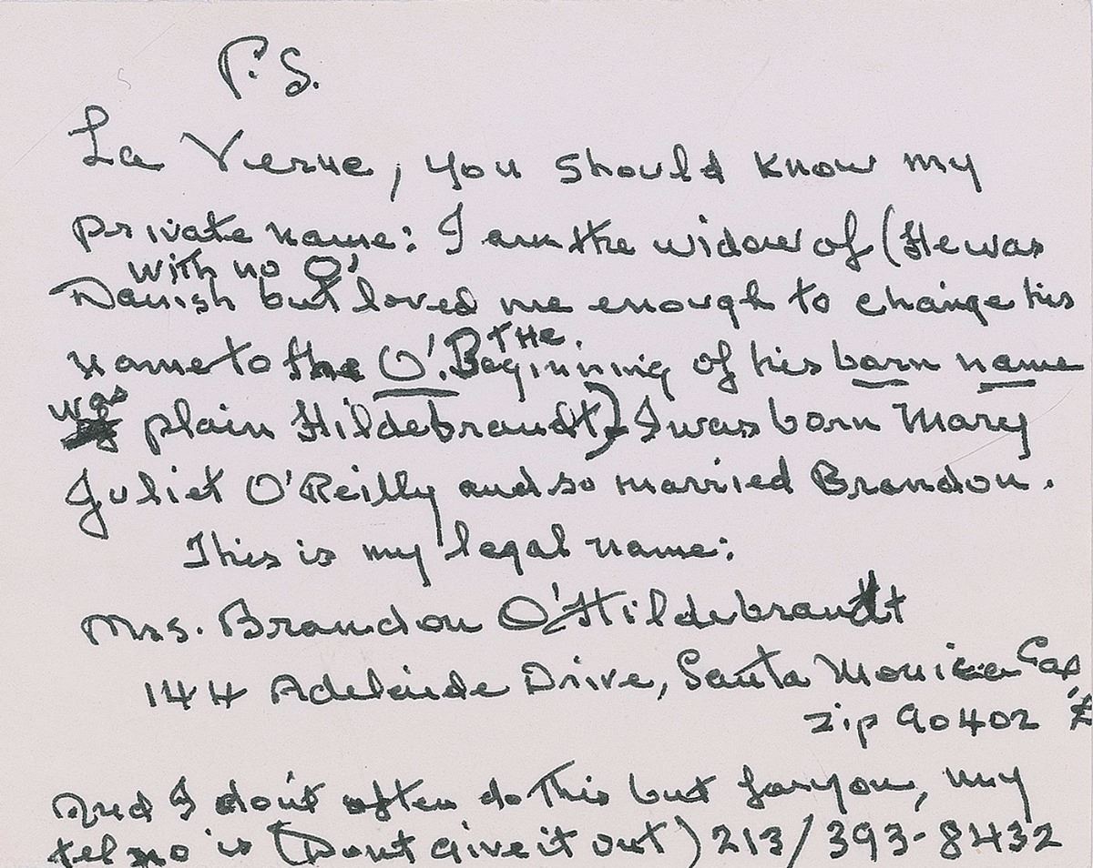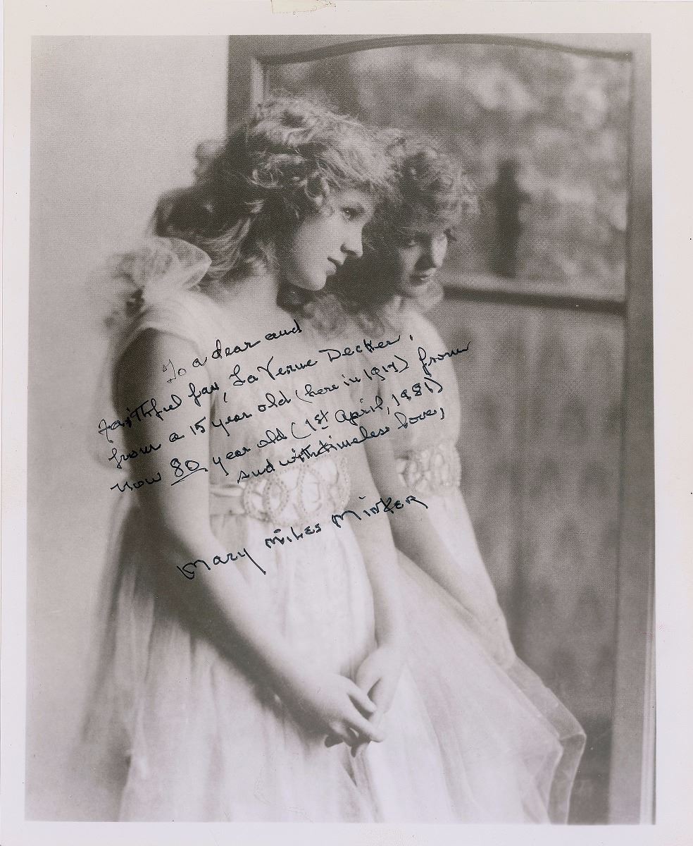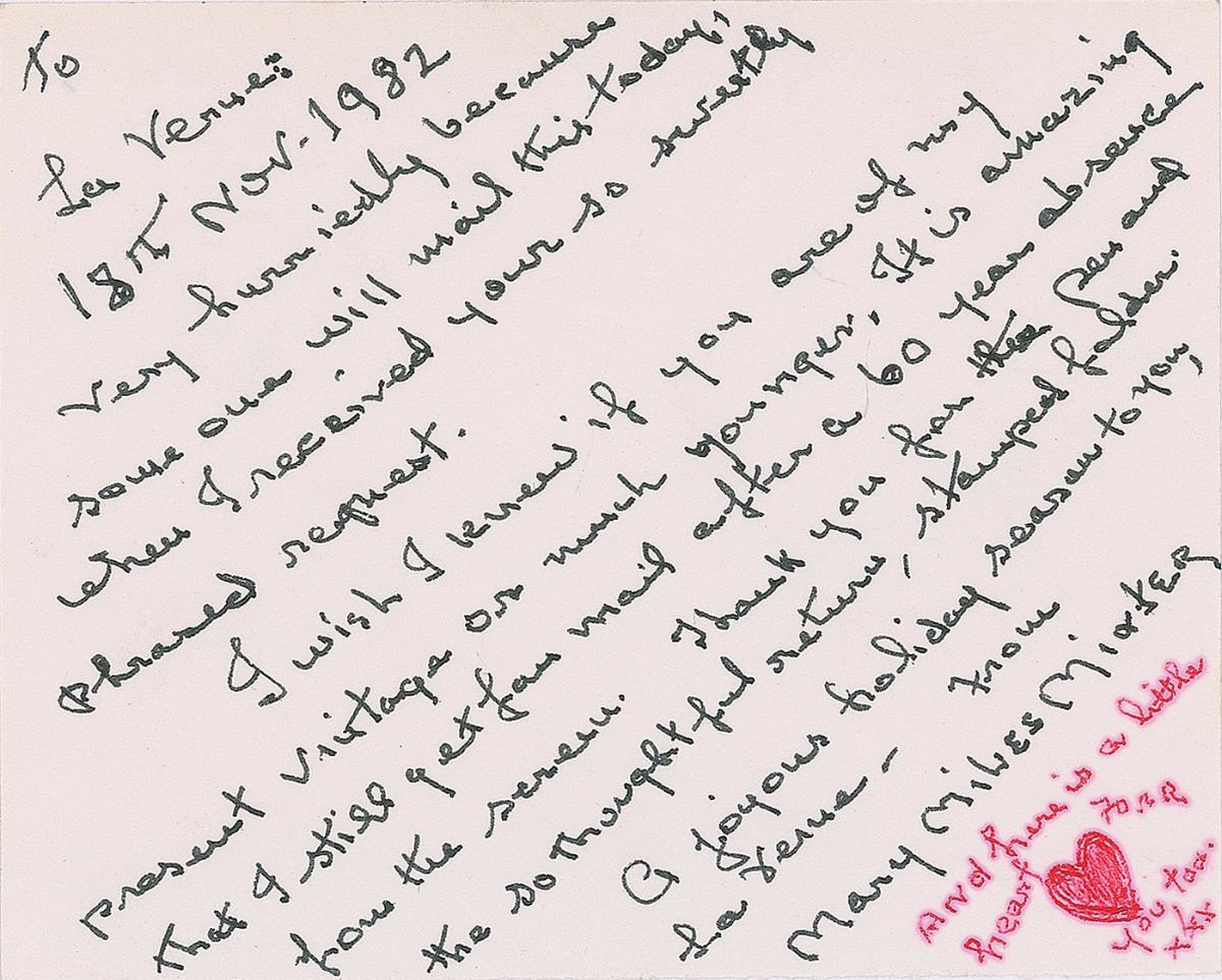 Two items: a lovely glossy 8 x 10 photo of Minter leaning against a mirror, signed and inscribed in black ink, “To a dear and faithful fan, La Verne Decker, from a 15 year old (here in 1917) from now 80 year old (1st April 1981), and with timeless love, Mary Miles Minter”; and an ALS, two pages, 5 x 4, November 18, 1982. Letter to La Verne, in part: “I wish I knew if you are of my present vintage or much younger. It is amazing that I still get fan mail after a 60 year absence from the screen. Thank you for the pen and the so thoughtful return, stamped folder.” Minter draws a heart in red ink, “And here is a little heart forr [sic] you, too. XXX.” The second page consists of a long handwritten postscript, in part: “You should know my private name: I am the widow of (he was Danish with no O’ but loved me enough to change his name to the O’. The beginning of his born name was plain Hildebrandt)—I was born Mary Juliet O’Reilly and so married Brandon. This is my legal name: Mrs. Brandon O’Hildebrandt.” In overall fine condition, with a small piece of tape to top edge of photo. A wonderful and insightful tandem of signed items from the typically withdrawn Minter, an actress whose autograph proved markedly difficult to obtain even during the peak of her short-lived movie career.