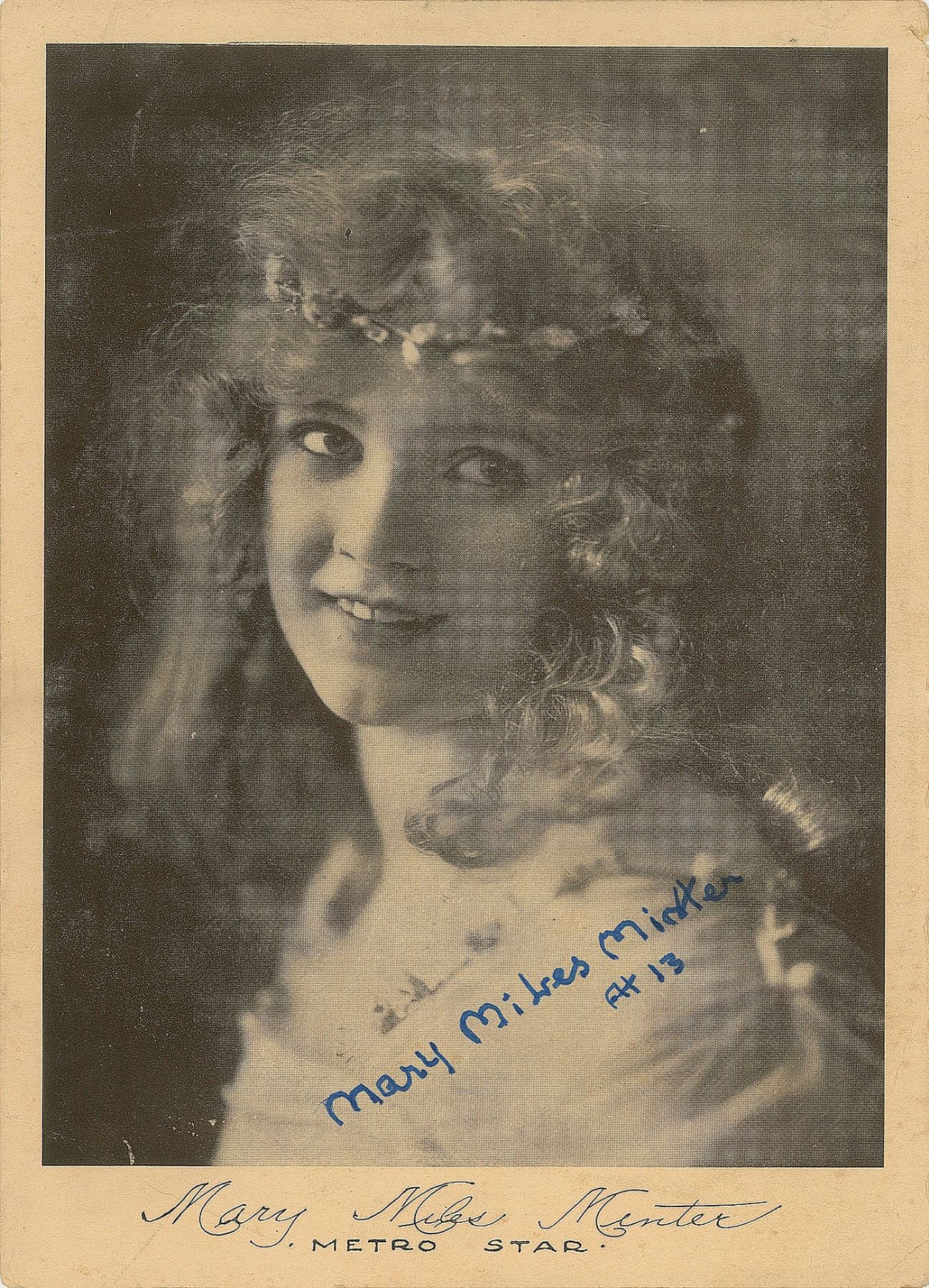 Uncommon 5 x 7 paperstock Metro Star publicity portrait of Minter, signed in blue ink, "Mary Miles Minter at 13." In fine condition.