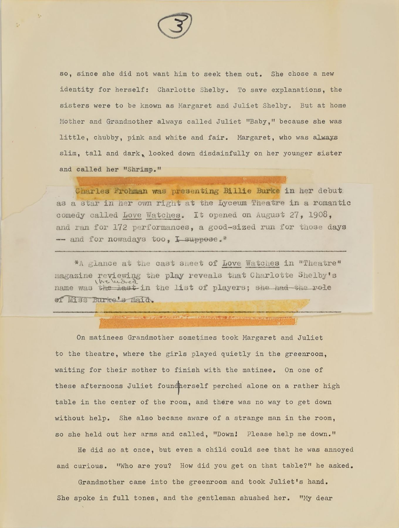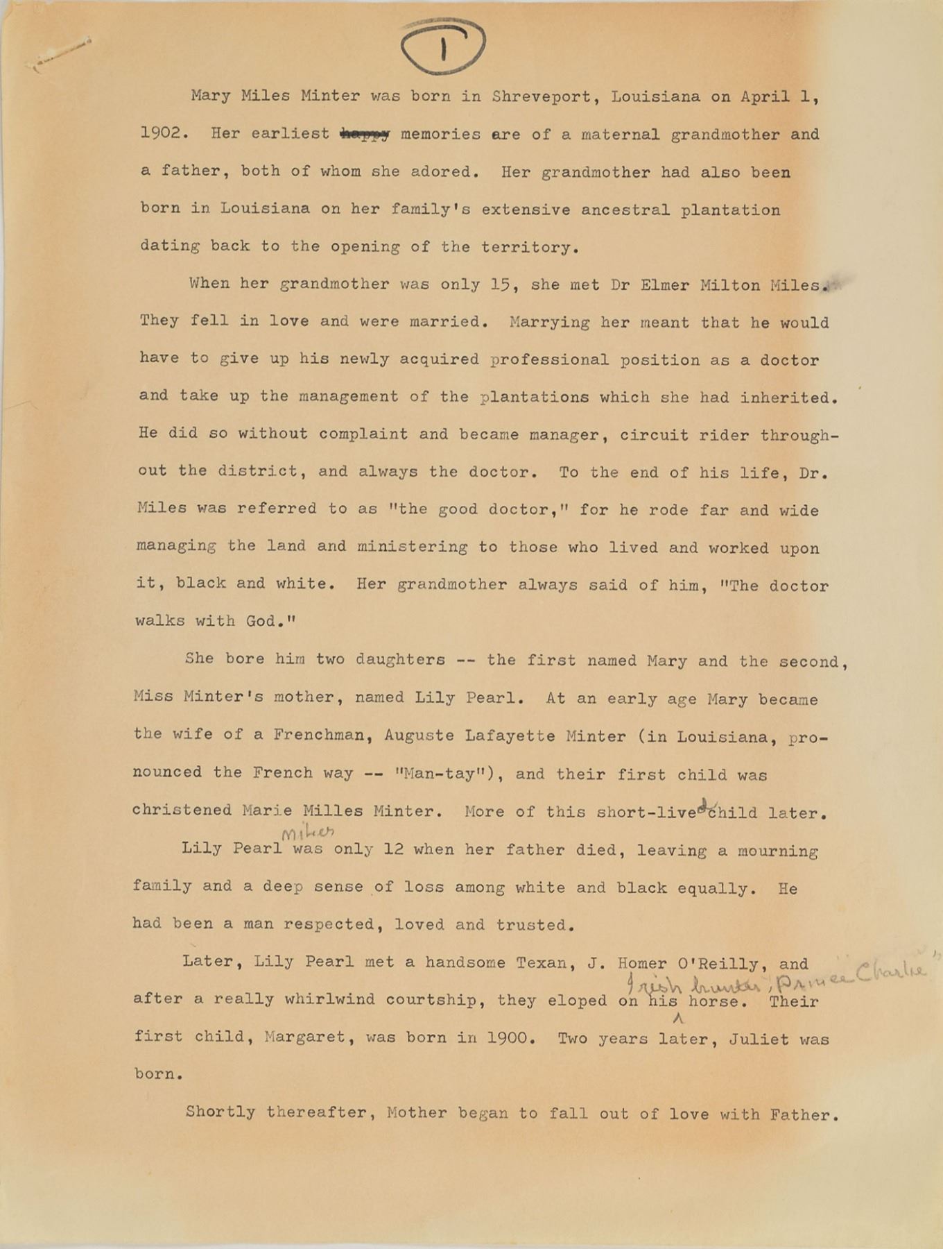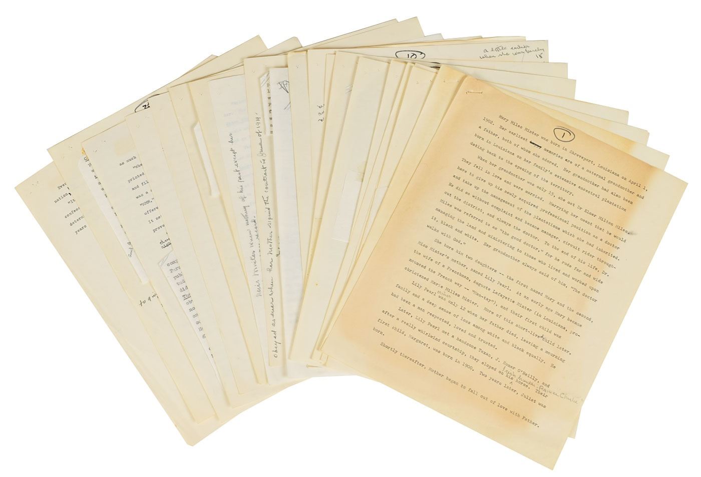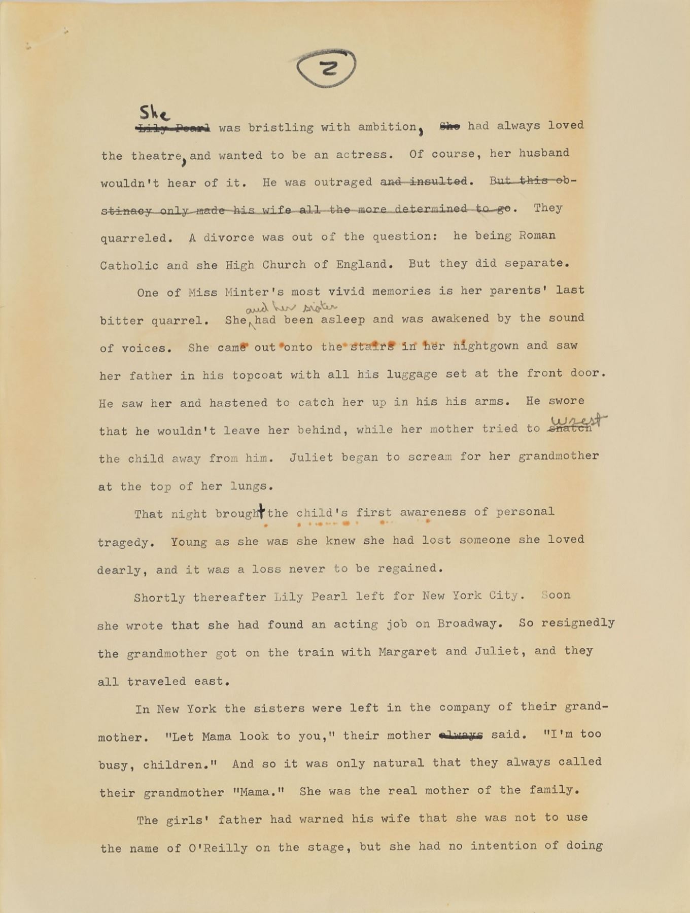 Typed manuscript of an unpublished biography for silent film actress Mary Miles Minter, who adds copious pencil emendations and annotations in her own hand throughout, twenty-one pages, 8.5 x 11, no date. A selection of Minter’s comments: “Poor Mr. Engle, who was much put to it to calm down his Peggy when she came off distinctly 2nd best, Mrs. S. & Mary retaining the suite"; “An oversight a little earlier when she was barely 15 when Lloyd Ingraham & his wife took her to a party to meet young film people in L. A.—an event which confirmed her shy estrangement from what should have been her natural young film friends and playmates. She was a little too young for them, a star, of which she was unconscious but they were not. They being featured players but one of them was a star at that time except Mabel Normand"; “[Miss Minter] obeyed as ever when her mother signed the contract in June of 1919”; regarding the actor and Minter’s suspected older beau, William Desmond Taylor, “Miss Minter knew nothing of his past except his outstanding war record”; another concerning Taylor, “I love you enough to want your happiness above my own—I told him that nothing, no amount of years or younger men of anything on earth would change my love for him. He looked at me a long time and finally said: Mary, you are my little white rose—I want you, I love you with all my heart and soul—now listen earnestly to what I have to say: If you will really try to let some more suitable man capture your heart but by the time your contract is finished have not done so, then by the living God, I am going to claim you for my own. But this I require of you—that you give yourself a fair chance. We sealed the pact with a kiss.” In very good to fine condition, with some toning, and staining from the old tape which was used to affix selected revisions.
