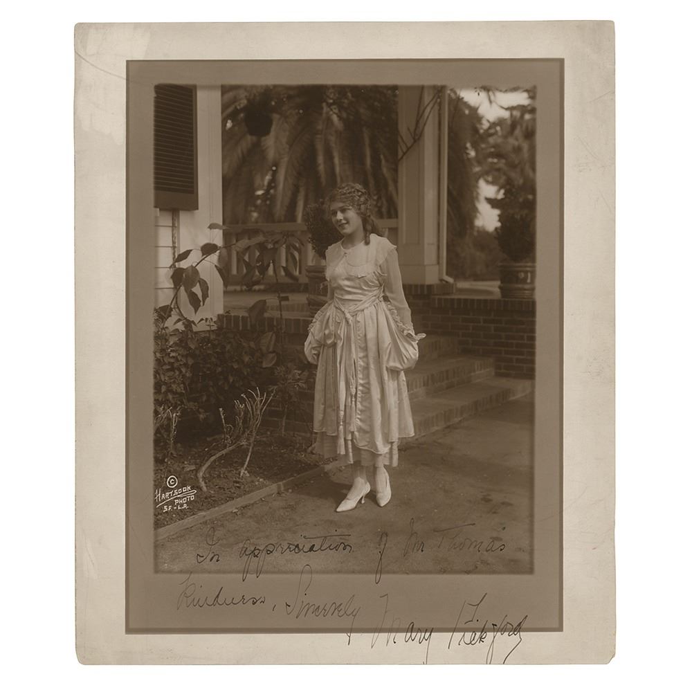 Vintage matte-finish 10 x 12 Hartsook Studio photo of the young actress standing outside in a lovely full-length pose, signed and inscribed in fountain pen, "In appreciation of Mr. Thomas' kindness, Sincerely, Mary Pickford.” In fine condition, with lightly trimmed borders.