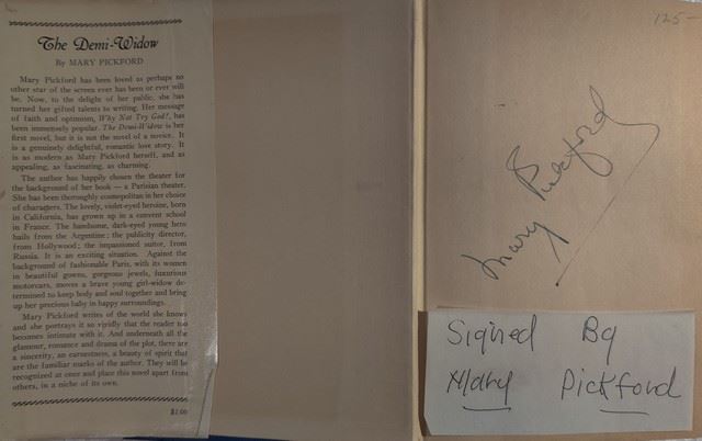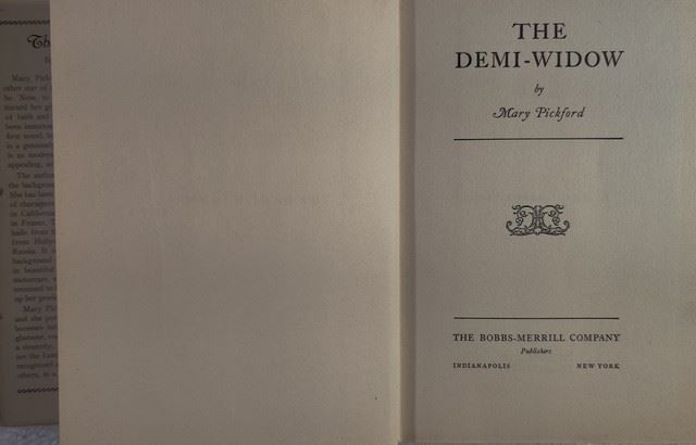 The Demi-Widow (The Bobbs-Merrill Company, 1935) first edition hard cover book, signed by Mary Pickford. 272 pages.