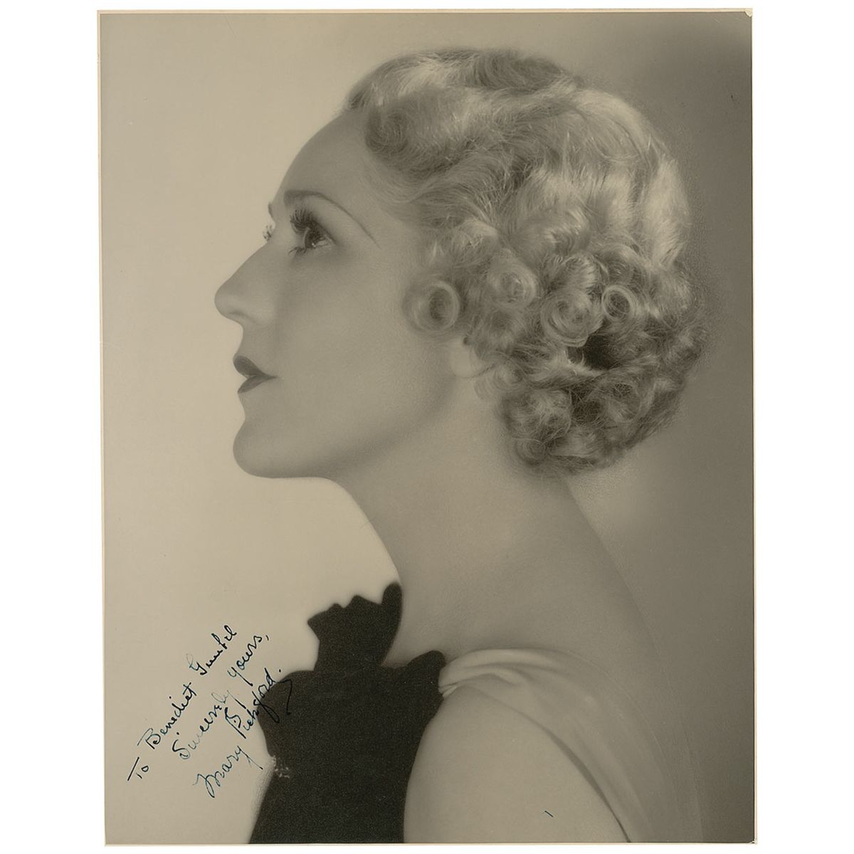 Vintage matte-finish 10.5 x 13.5 photo of Pickford in profile, signed and inscribed in fountain pen “To Benedict Gumbel, Sincerely yours, Mary Pickford.” In fine condition, with a couple trivial corner tip creases.