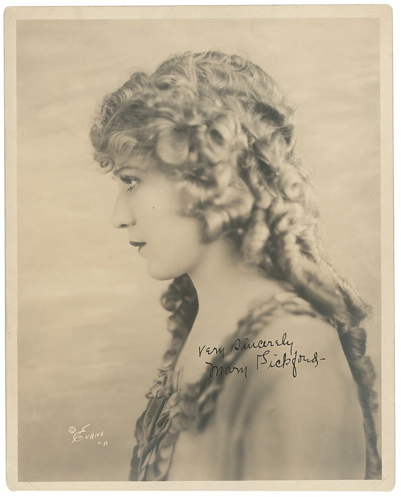 Vintage matte-finish 8 x 10 photo of Pickford in profile, signed in fountain pen, “Very sincerely, Mary Pickford.” In fine condition, with some scattered light edge creases, a hint of light silvering, and some light corner curling.