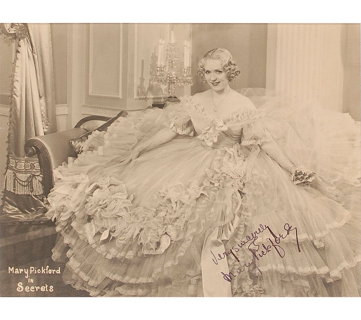 Vintage matte-finish 8.25 x 6.25 publicity photo of Pickford from Secrets, signed in fountain pen, “Very sincerely, Mary Pickford.” Matted to an overall size of 13 x 11. In fine condition.