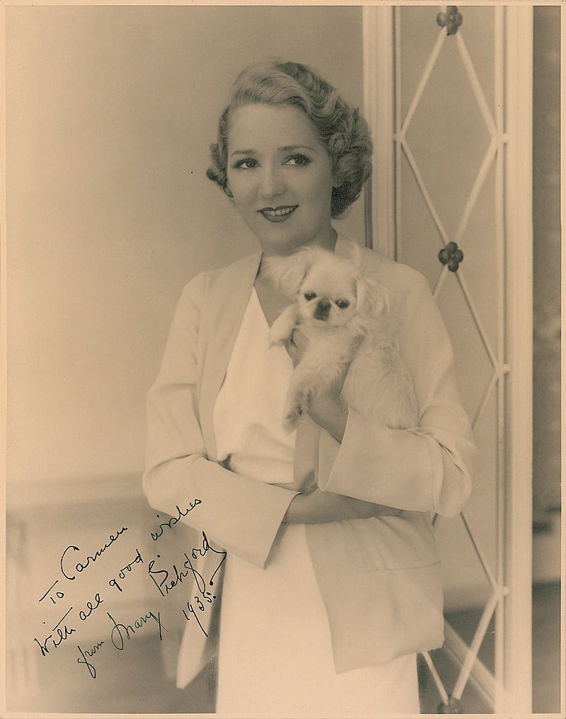 Vintage matte-finish 7.5 x 9.5 photo of Pickford holding her dog, signed and inscribed in fountain pen “To Carmen, With all good wishes from Mary Pickford 1935.” In fine condition, with lightly trimmed edges.