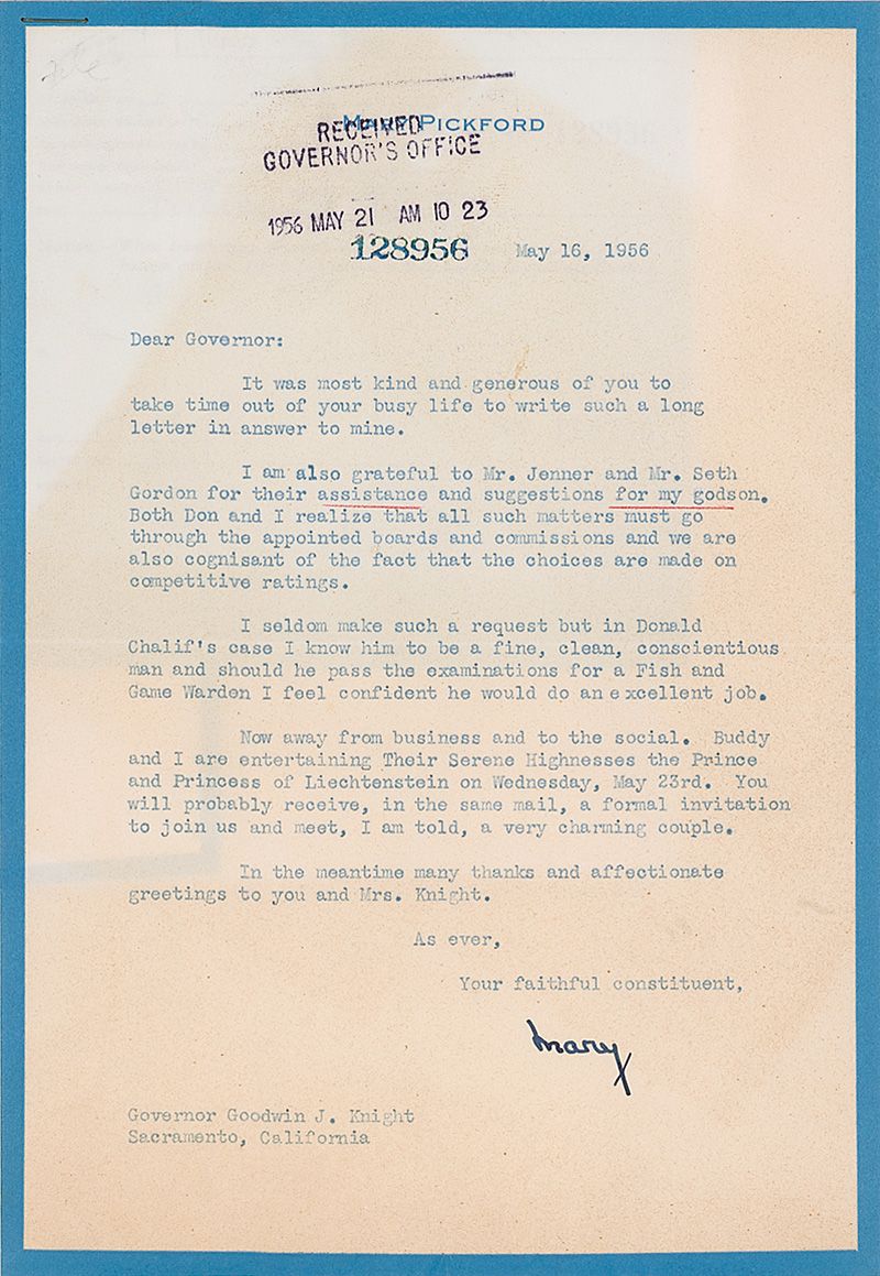 TLS signed “Mary,” one page, 6.75 x 9.75, personal letterhead, May 16, 1956. Pickford writes a letter of thanks to California Governor Goodwin J. Knight, in part: “I am also grateful to Mr. Jenner and Mr. Seth Gordon for their assistance and suggestions for my godson. Both Don and I realize that all such matters must go through the appointed boards and commissions and we are also cognisant of the fact that the choices are made on competitive ratings. I seldom make such a request but in Donald Chalif’s case I know him to be a fine, clean, conscientious man and should he pass the examination for a Fish and Game Warden I feel confident he would do an excellent job. Now away from business and to the social. Buddy and I are entertaining Their Serene Highnesses the Prince and Princess of Liechtenstein on Wednesday, May 23rd. You will probably receive, in the same mail, a formal invitation to join us and meet, I am told, a very charming couple.” In very good condition, with toning, a few ink notations, office stamps to the top of the letter, and the mailing envelope and transmittal sheet stapled to the top left corner. Accompanied by the original mailing envelope, a mail transmittal sheet, a Western Union telegram, and an invitation to the ‘Man of the Year’ Dinner Dance honoring Mary Pickford. Aside from acting as governor, Knight was also a Superior Court judge in Los Angeles, and presided over weddings and divorces for various Hollywood stars.