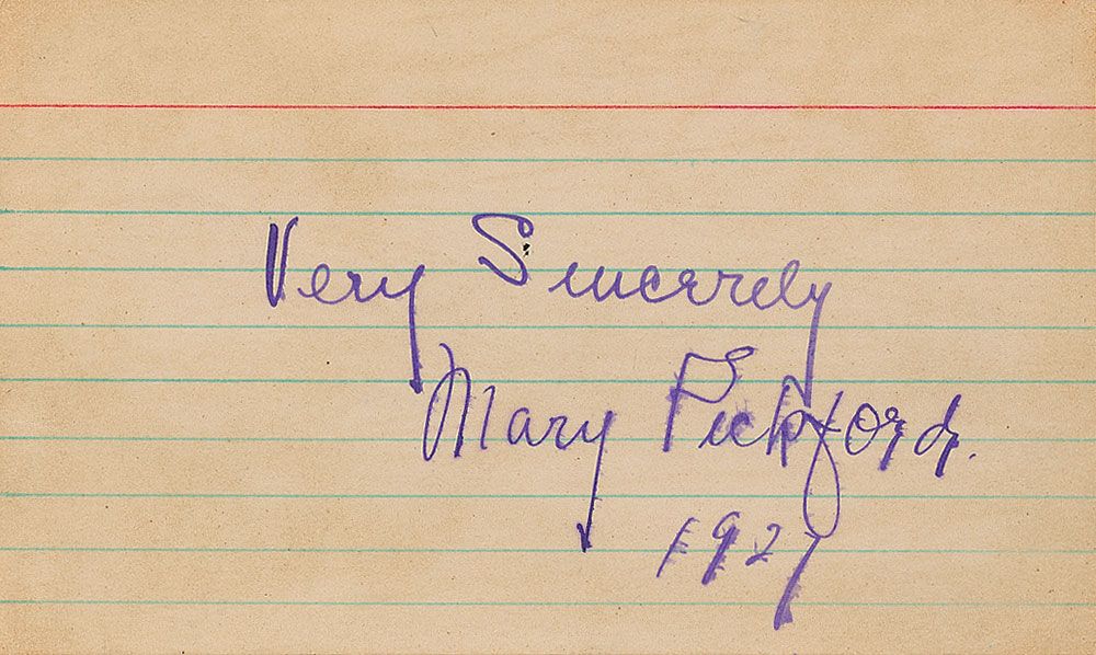 Vintage purple ink signature, “Very Sincerely, Mary Pickford, 1927,” on an off-white 5 x 3 lined card. Light overall toning and feathering to ink, otherwise fine condition.