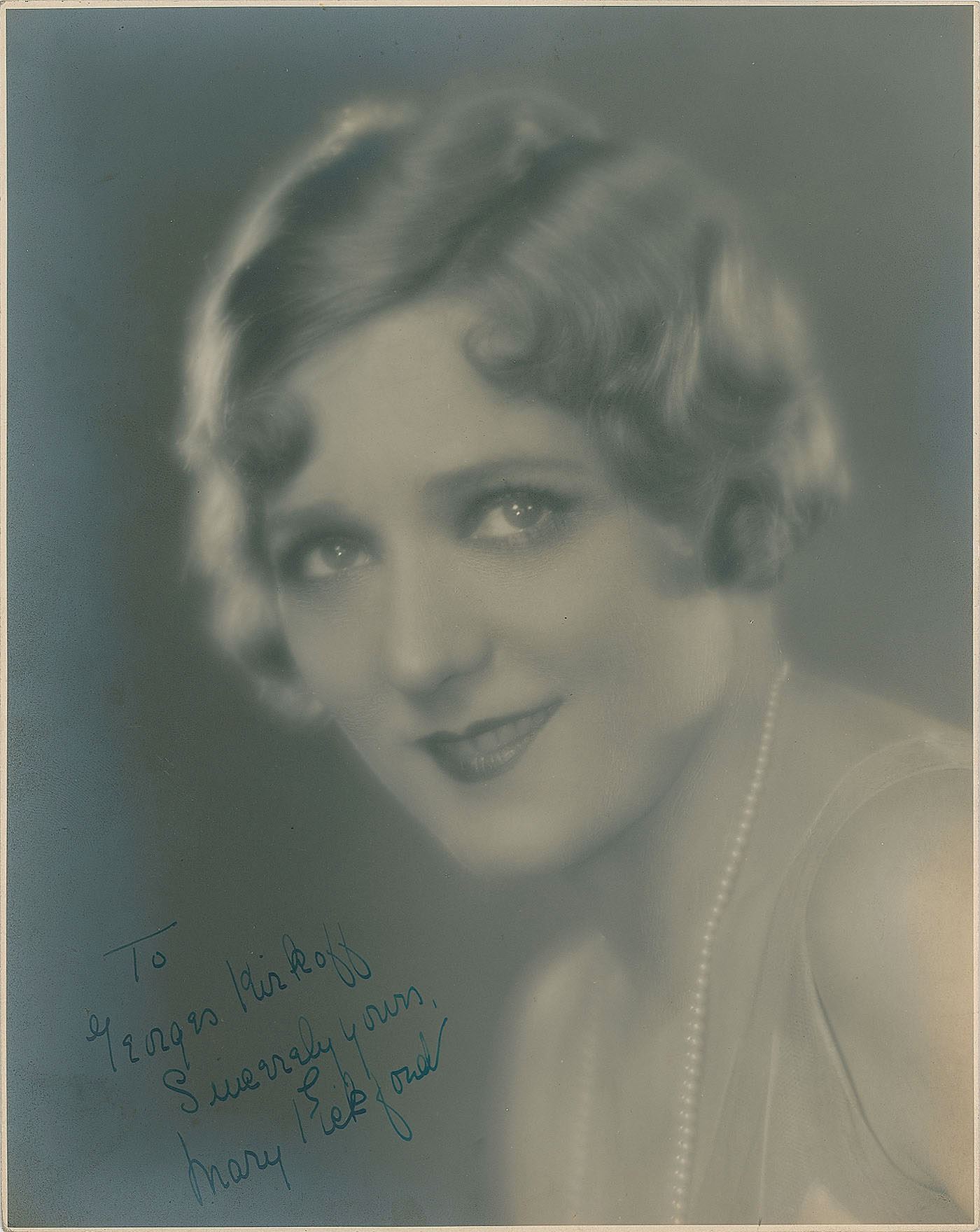 Vintage matte-finish 7.5 x 9.5 photo of the lovely actress wearing pearls, neatly signed and inscribed in fountain pen, "To Georges Kirkoff, Sincerely yours, Mary Pickford.” In fine condition, with some light silvering.