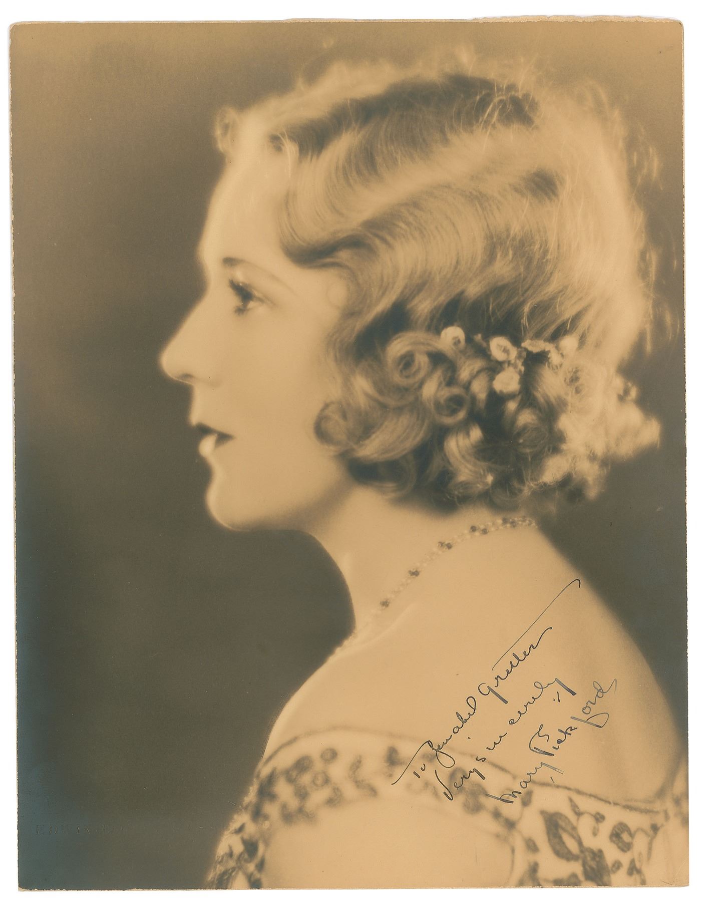 Exquisite sepia matte-finish 10.25 x 13.25 portrait of Pickford in a lovely profile pose, signed and inscribed in fountain pen, "To Jenabel Gretter, Very sincerely, Mary Pickford.” Lower left corner bears a blindstamp from Edwin Bower Hesser. In very fine condition.