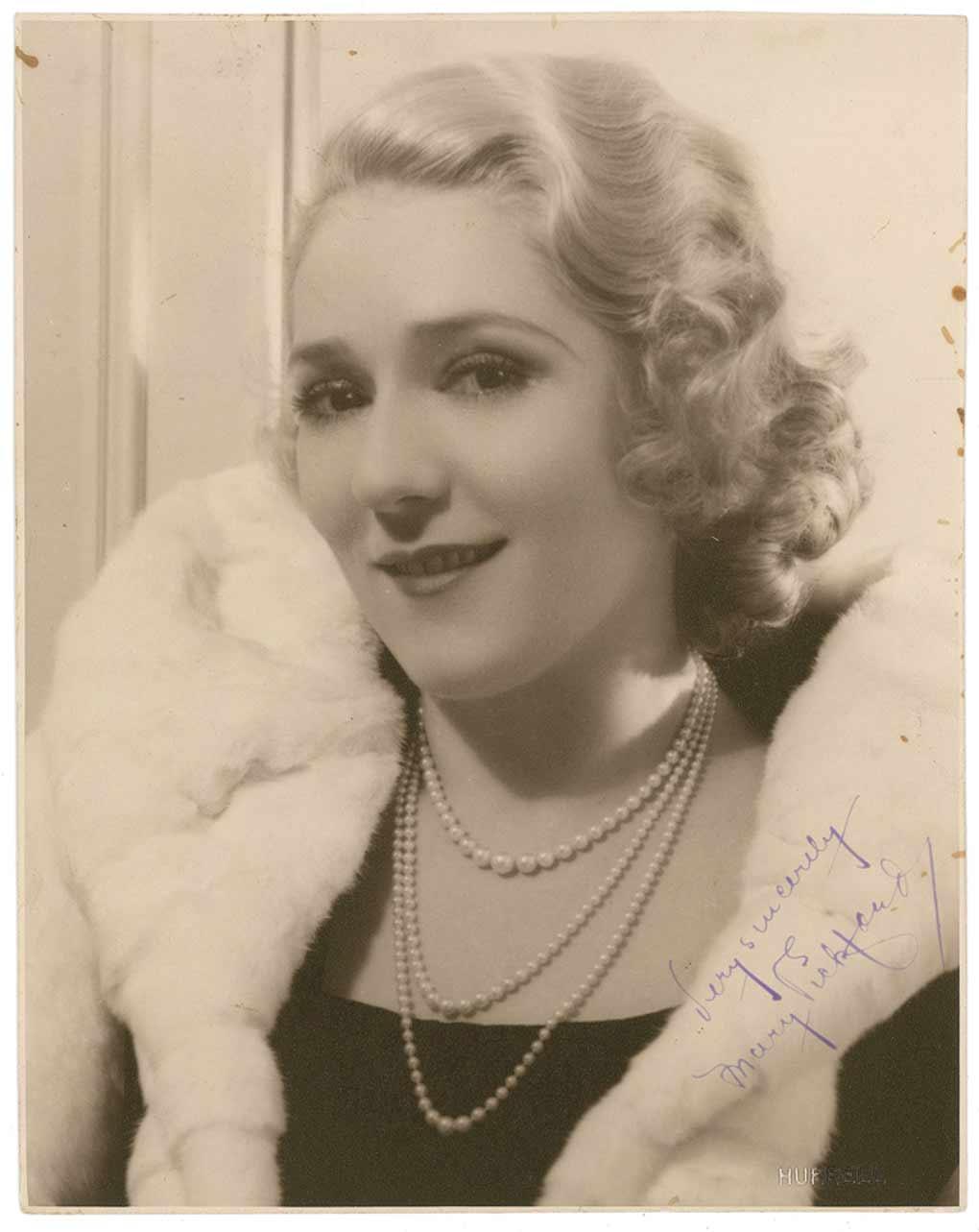 Vintage matte-finish 7.5 x 9.5 Hurrell photo of Pickford in a fur stole and pearl necklace, signed in purple fountain pen, “Very sincerely, Mary Pickford.” Lightly trimmed right edge, and some scattered light edge foxing, otherwise fine condition.