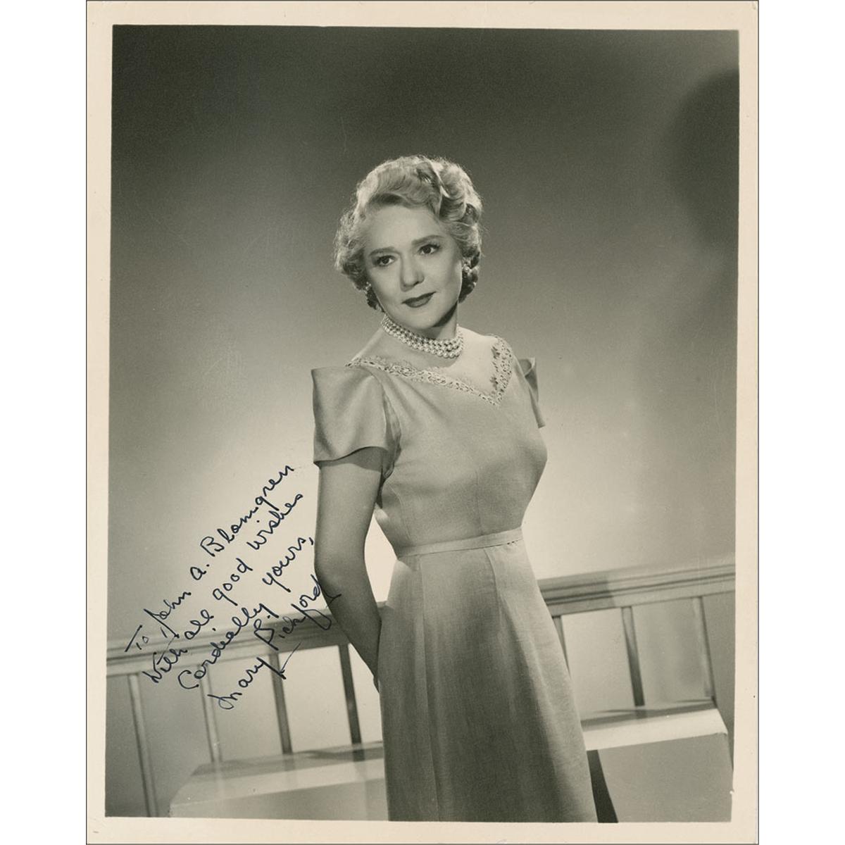 Vintage matte-finish 8 x 10 photo of the middle-aged actress, signed and inscribed in fountain pen “To John A. Blomgren, With all good wishes, Cordially yours, Mary Pickford.” In very good condition, with scattered light edge dings and creases, and a few mild creases to background.