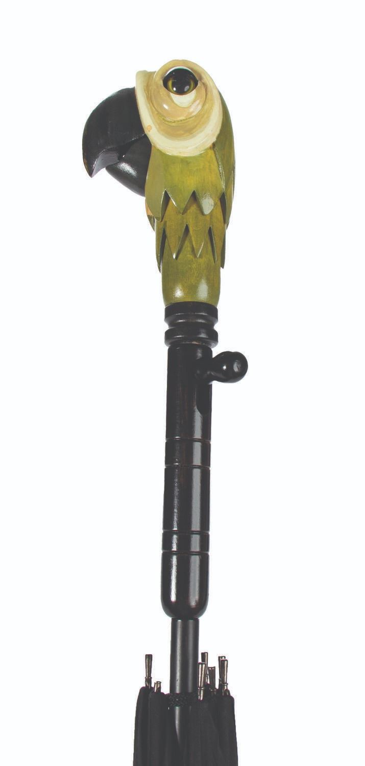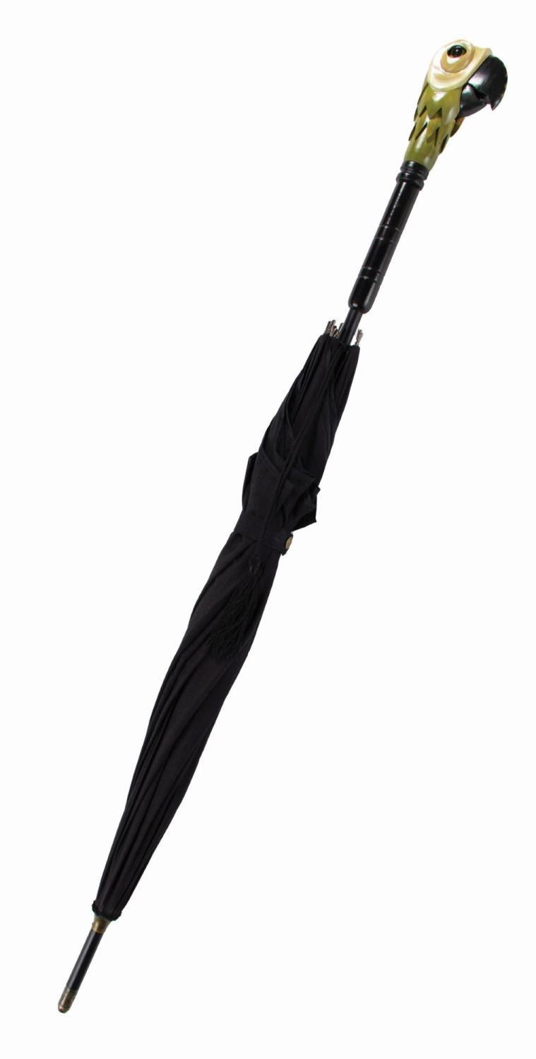 (Disney, 2006) A very rare Mary Poppins Enchanted Umbrella designed by Kevin Kidney and Jody Daily. The umbrella features a hand-carved wooden parrot handle with glass eyes, and has a spring-loaded level in the handle that animated the parrot's lower jaw. The umbrella comes in its original box with Certificate of Authenticity. Measuring 39" long, the umbrella is in very good condition with some surface wear from prior display, including some chipping to the paint and minor wear to the tip. There is some surface wear to the box.