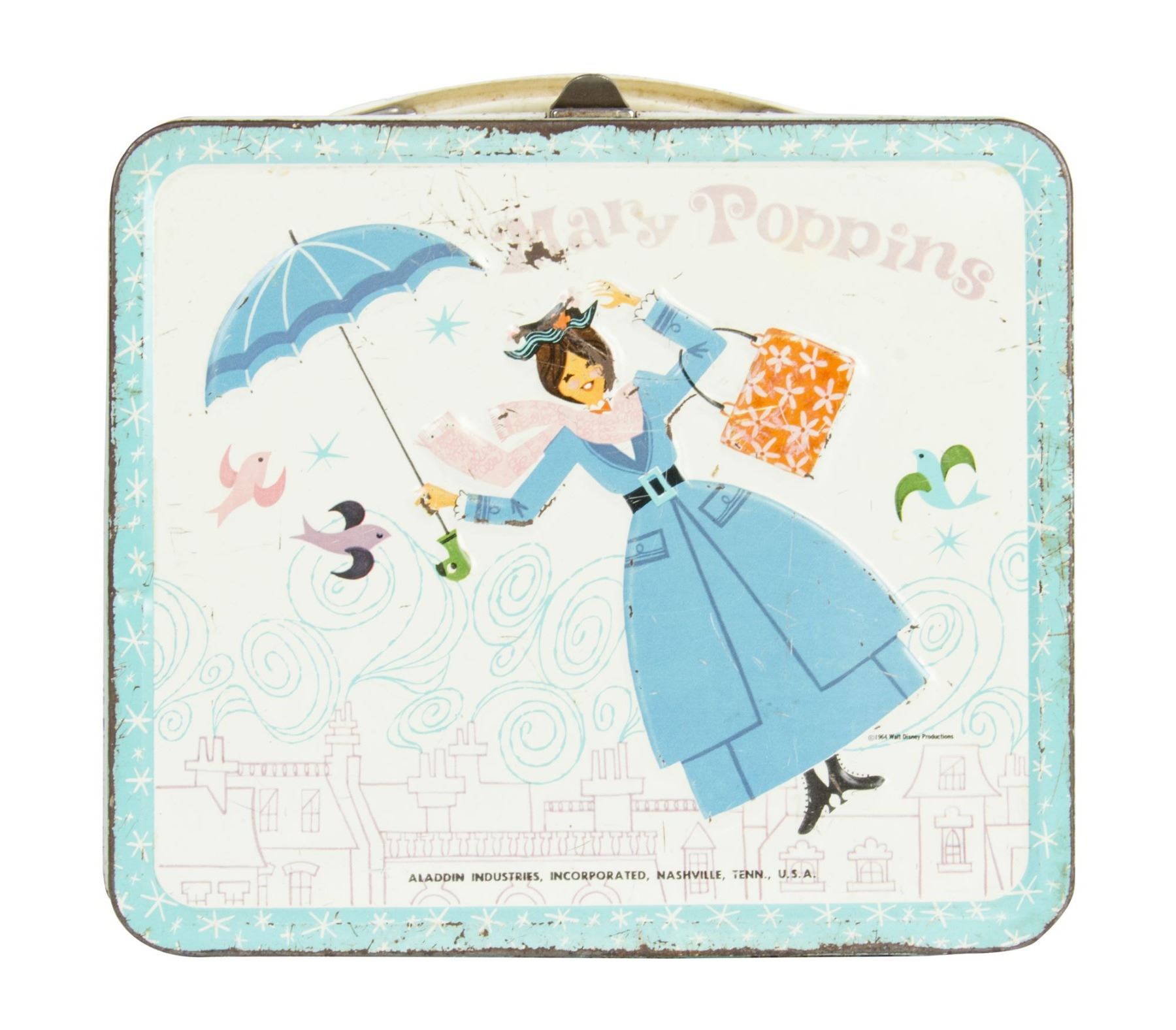 (Disneyland, 1964) A stylish metal lunch box by Aladdin Industries featuring imagery from Walt Disney's feature film "Mary Poppins". The lunch box has a working clasp and includes the original thermos and lid. Measuring 8"x4" and 8" tall including the handle, the lunch box is in poor to fair working condition with some surface-scratches and areas of discoloration from use.