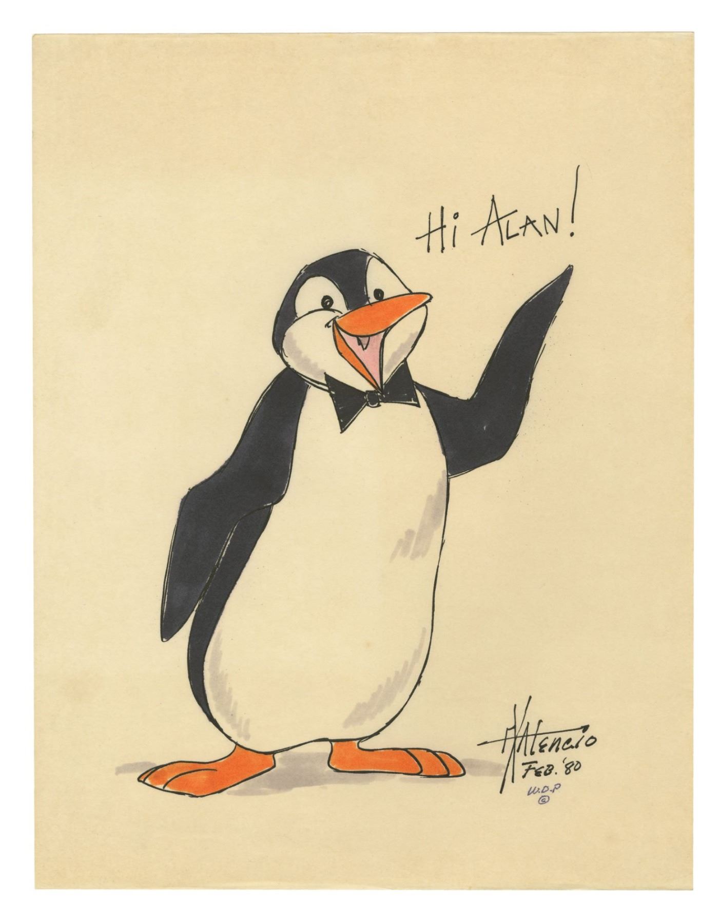 (Disney, 1980) An original drawing of a penguin from Walt Disney's "Mary Poppins" that was created by animator X. Atencio. Accomplished in ink and colored marker on thin paper, the drawing reads "Hi Alan!" and is signed and dated Feb '80 by Atencio in the lower-right corner. Measuring 11"x8.5", the drawing is in very good condition with little wear.