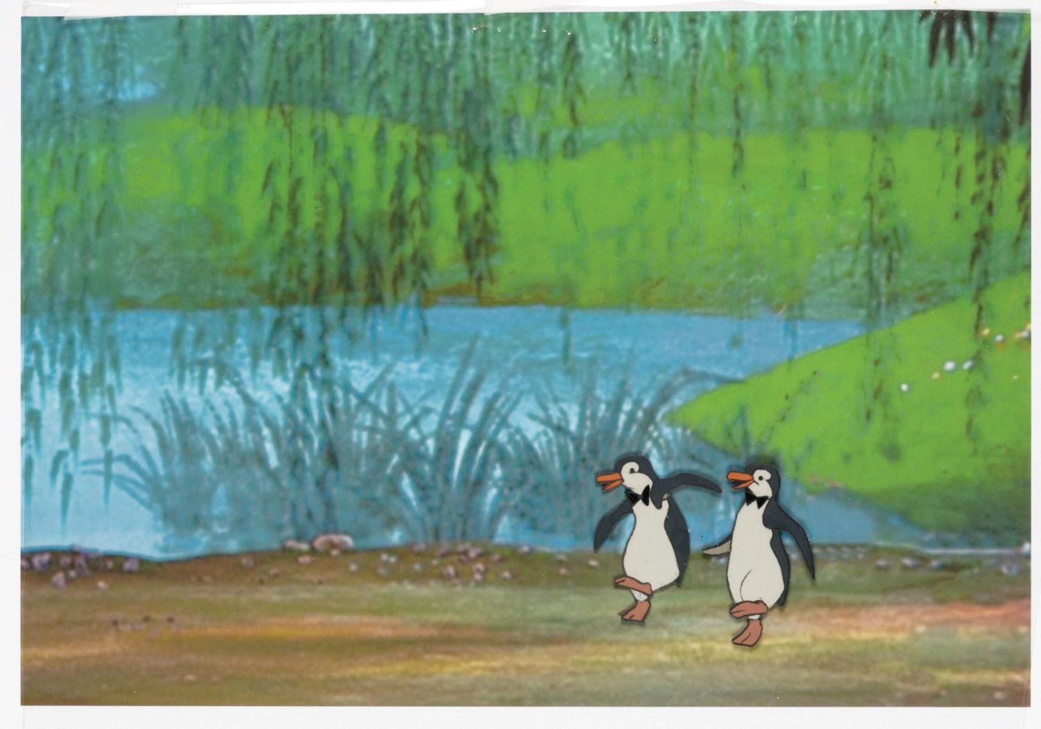 (Disney, 1964) A hand-painted cel of two Penguin Waiters used in the production of Walt Disney's Mary Poppins. This cel appeared during the live-action and animated "Penguin Dance" segment that also prominently featured Dick Van Dyke. The piece has a painted character image size of 2.5"x2.5" on its 10"x12" trimmed cel sheet. The piece displays in very good condition, exhibiting slight wear from production, and includes a scene-matching printed background.