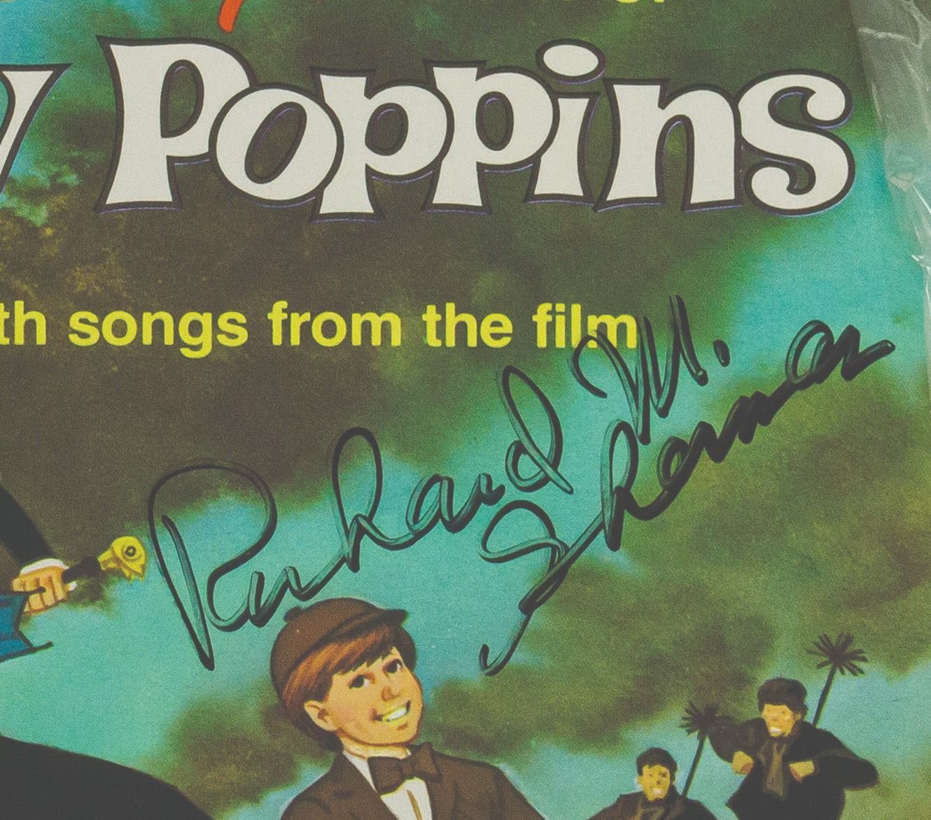 (Disney, 1977) A souvenir 33 1/3 rpm record featuring songs from Walt Disney's Mary Poppins, signed on the cover by the film's composer, Richard M. Sherman. The record is unopened, save for a removed portion of the plastic wrapping which allowed Sherman to sign the cover. Measuring 7.25"x7.25", the record is in very fine condition.