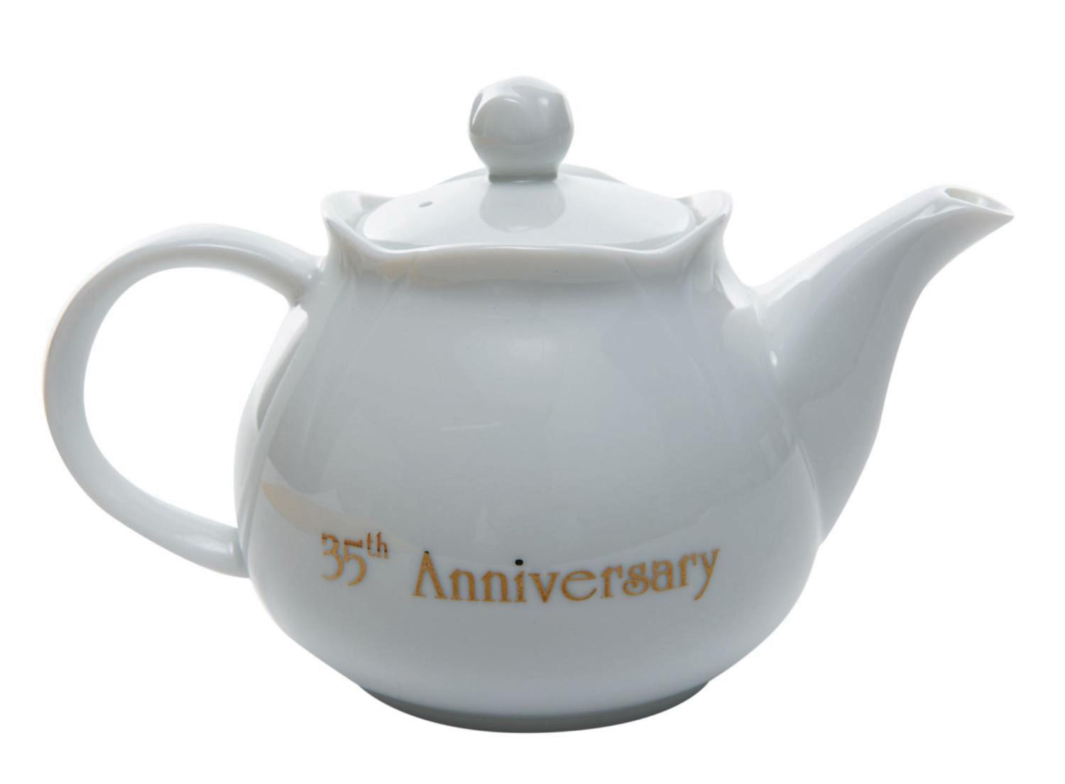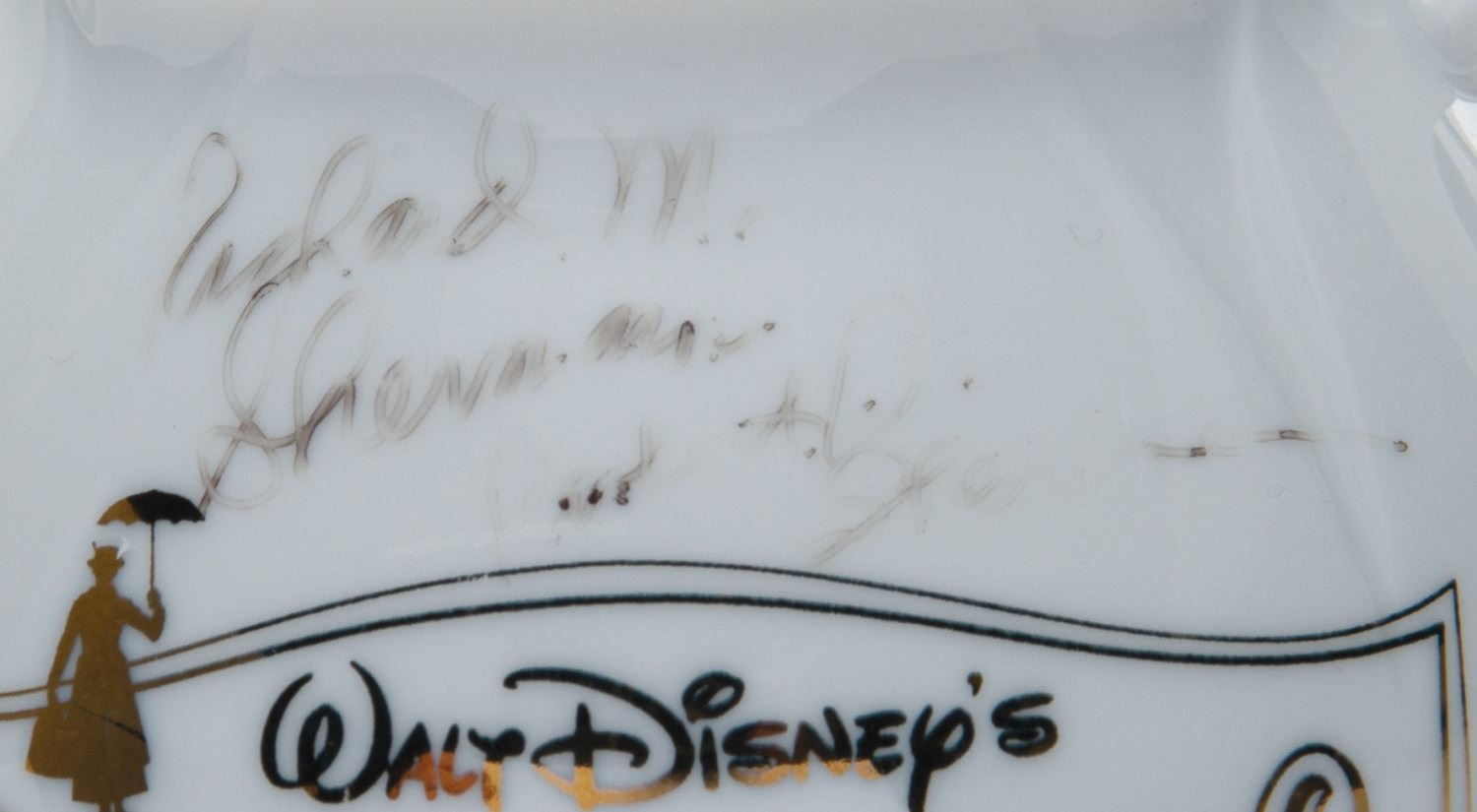 (Disney, 1999) A Walt Disney Company exclusive Mary Poppins teapot signed by Richard and Robert Sherman. Created to coincide with the 35th anniversary of the film in 1999, the charming teapot measures 7.5" from handle to spout. It is in very fine condition, retaining the "TWDC Employee Exclusive" backstamp under the "bottommost rung." The signatures have faded due to the glossy nature of the teapot, with Richard's still the most pronounced.