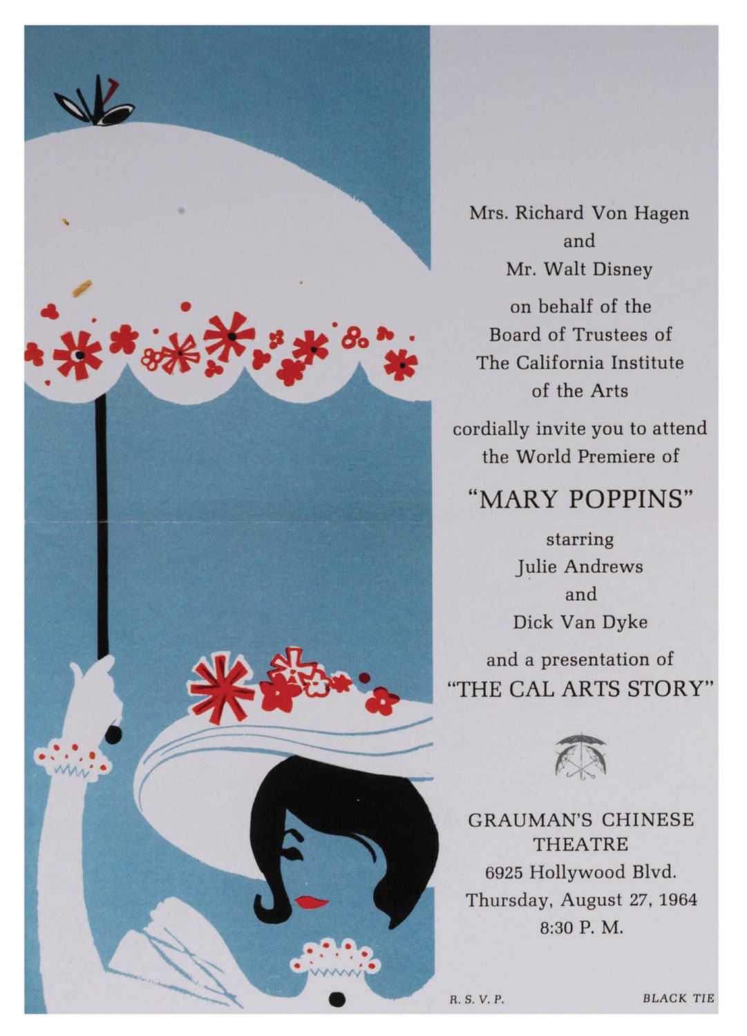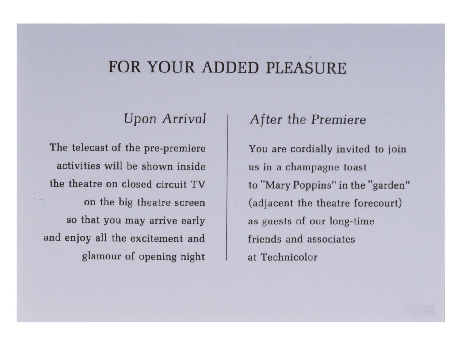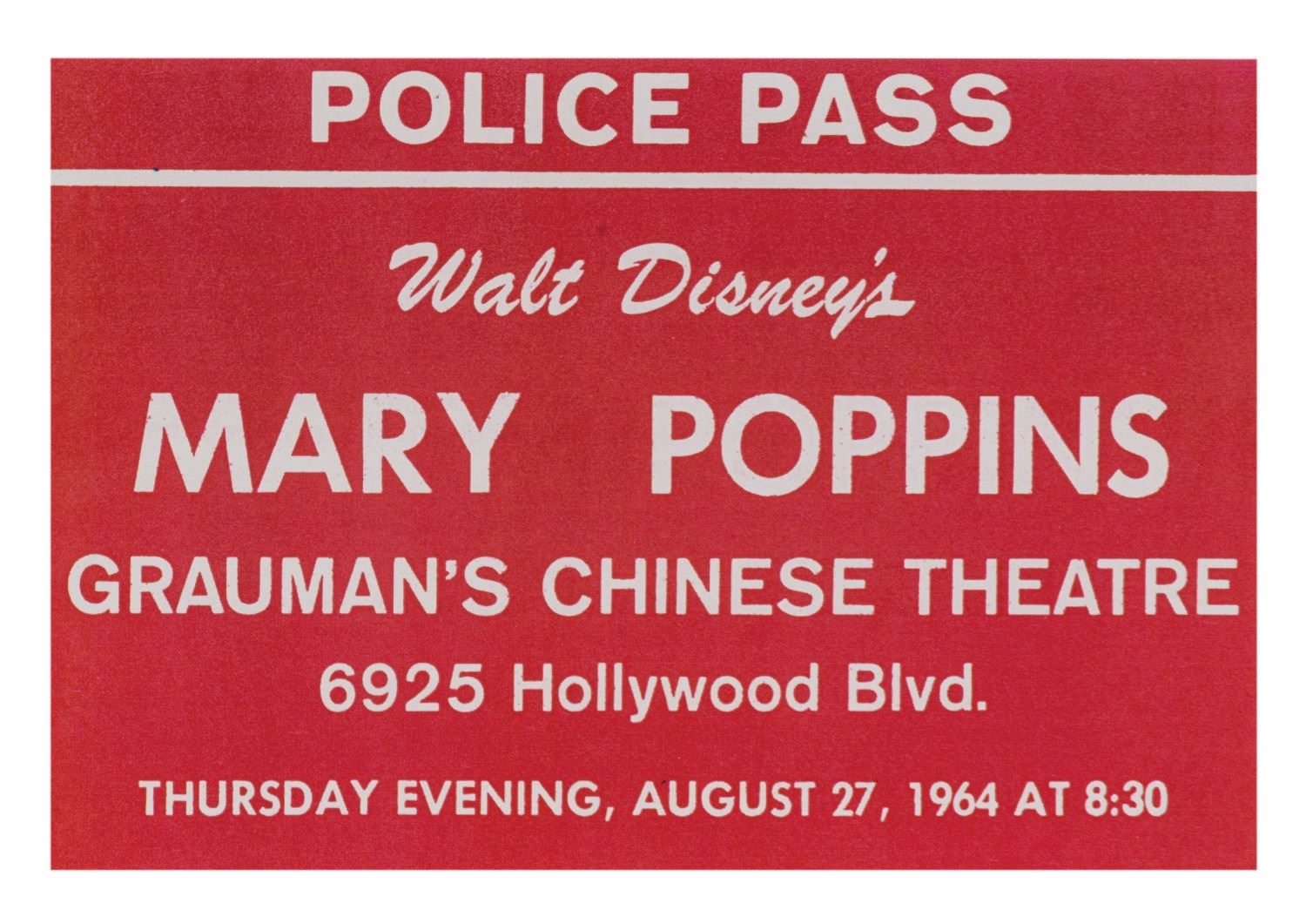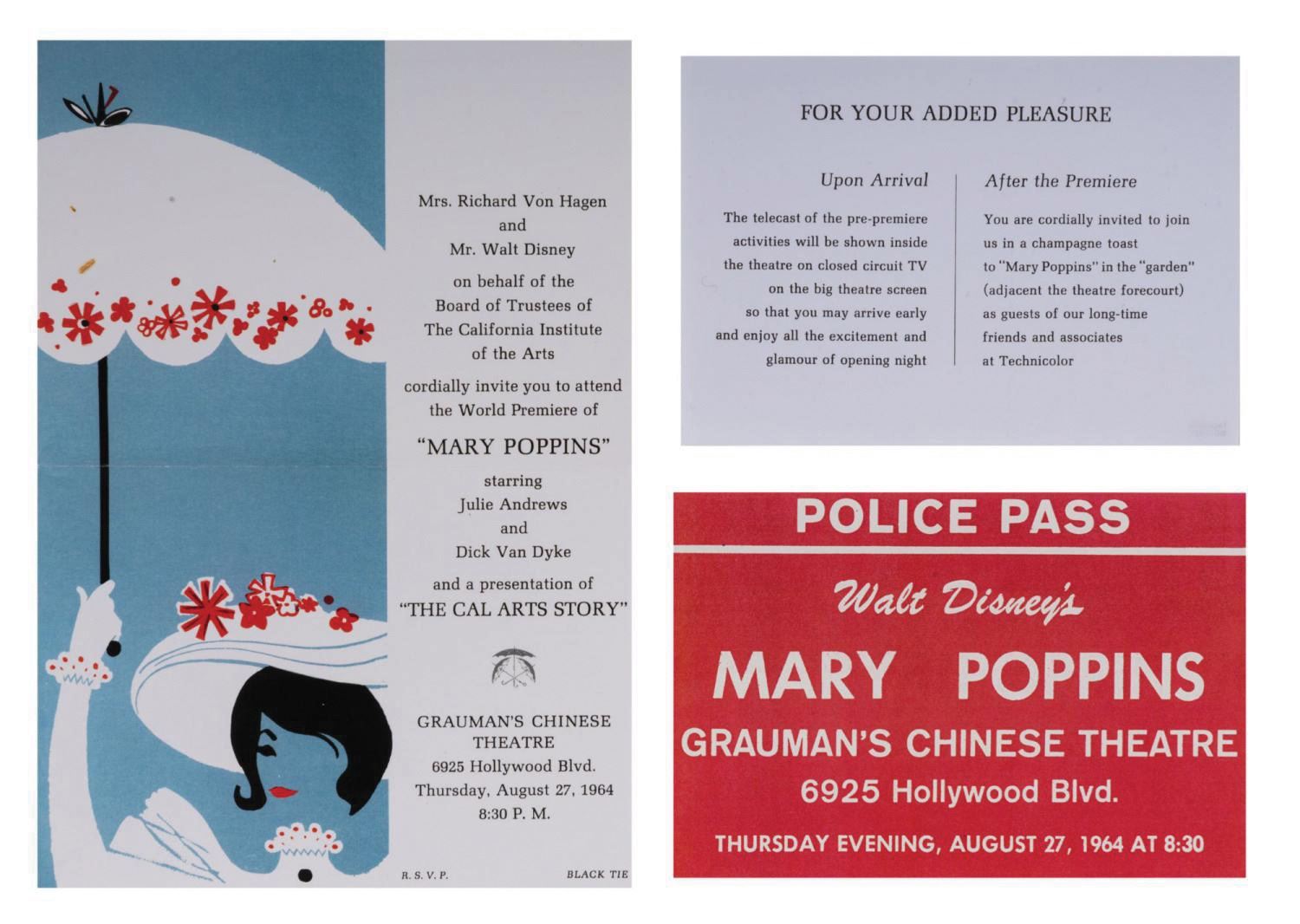 (Disney, 2003) A Disney-produced reproduction of the invitation to the Mary Poppins World Premier and presentation of "The Cal Arts Story" held at the Grauman's Chinese Theater in 1964. The invitation comes with a reproduction windshield mountable Police Pass and announcement of pre-premier activities as well as a post-premier "champagne toast." The historic set was reproduced by the Walt Disney Archives in 2003. The invitation measures 7.5"x5.25", and the items are in fine condition with little wear.