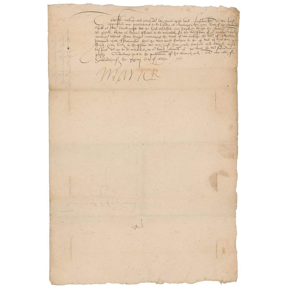 Exemplary LS in Scots, signed “Marie R,” one page, 8.25 x 12, “Holyrood” (“At our abbey of Halirudehous”), March 23, 1566/7, written to William Keith, the 3rd Earl Marischal. Queen Mary summons the Earl Marischal to a significant parliamentary event in Edinburgh on April 14, strongly urging his attendance. In part (translated): “There are various matters to be discussed touching the welfare of our realm and…issues relating to the prosperity of our cousin the Earl of Huntly” [in Scots: “Thair is divers effaces to be intreated for the welffair of or. realme and…thingis concernyng the weill of our cousing the erle of hwntlie”]. The Queen adds that his “good counsel and advice” [in Scots: “guid counsall and adwyis”] would be very beneficial. With address, later docket to reverse, and very slight traces of a red wax seal. Eight neat slits from the original string closure, with only one affecting two words and not the signature, otherwise fine condition. Document is housed in a beautiful hunter green cloth display folder emblazoned with "Mary Stuart, Queen of Scots" on the front in gold.