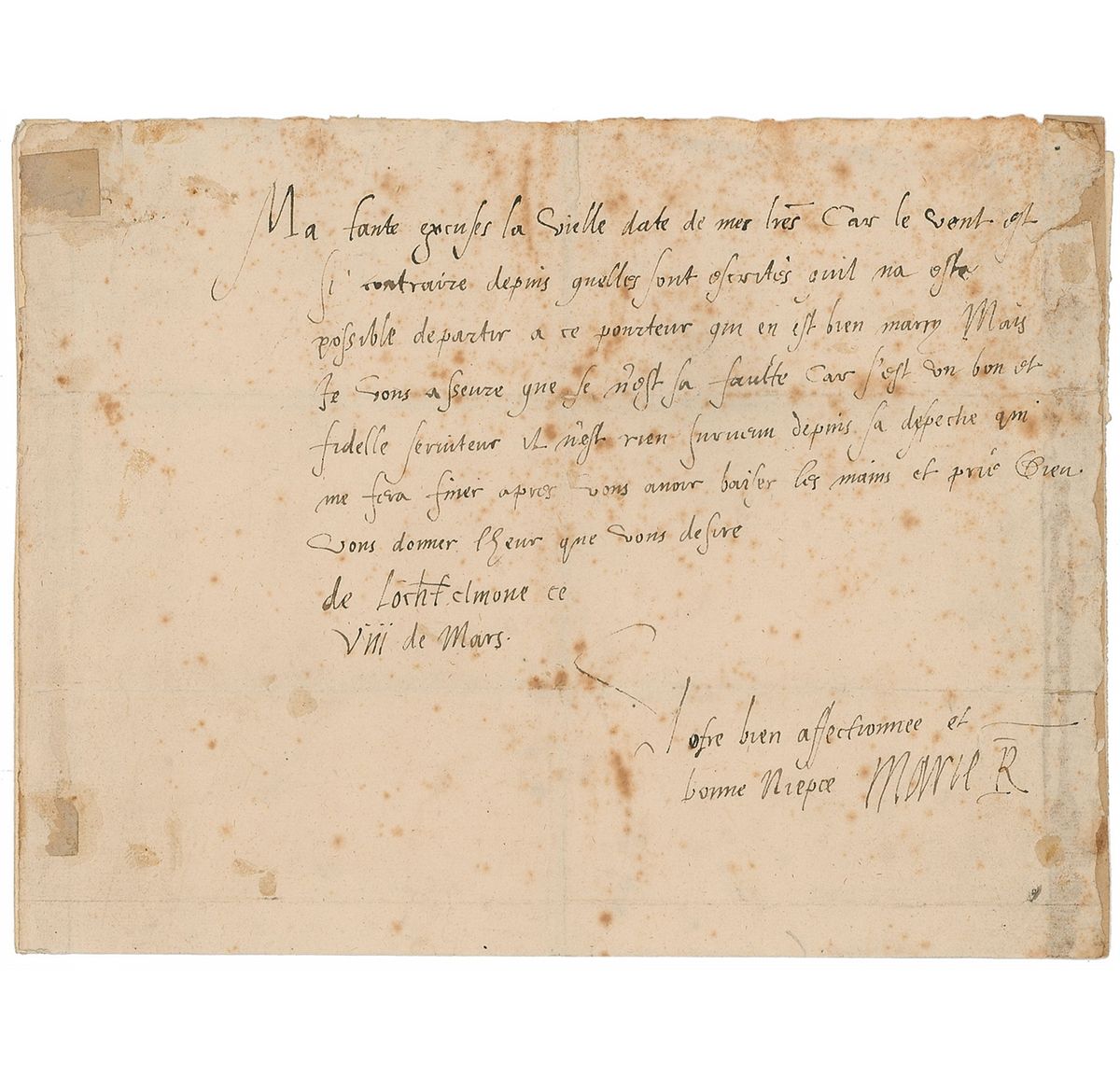 Very early and incredibly rare LS in French, signed “Your very affectionate and good-hearted Niece, Marie R,” one page, 8 x 12.25, March 8, 1564. Letter to Antoinette de Bourgogne apologizing for the lateness of several letters. In full (translated): “My aunt, excuse the old date of my letters [letters abbreviated in the text] since they have been written because of such rear/head wind that it was not possible for the porter who is in fact a good seaman to take them. But I assure you that it is not his fault for I have a good and faithful servant. Nothing has occurred since his last dispatch that he will have finished for me after having kissed your hands and pray to God to grant you what you desire.” In very good condition, with intersecting folds, mounting remnants and repairs to right edge, and scattered foxing, none affecting the legibility of the letter. Published in A. Labanoff’s Lettres, Instructions et Memoires de Marie Stuart, Reine d'Ecosse (London 1844), volume I.