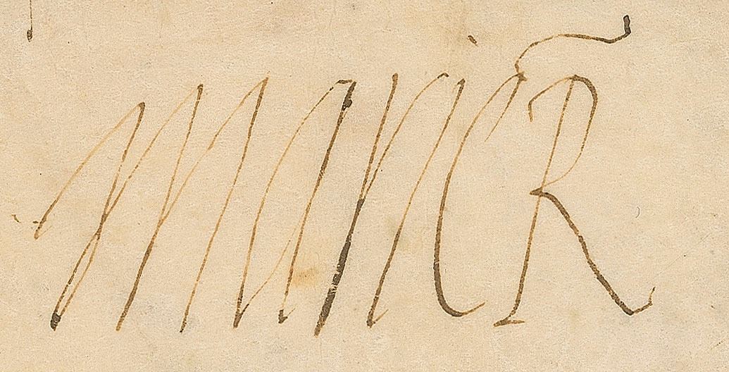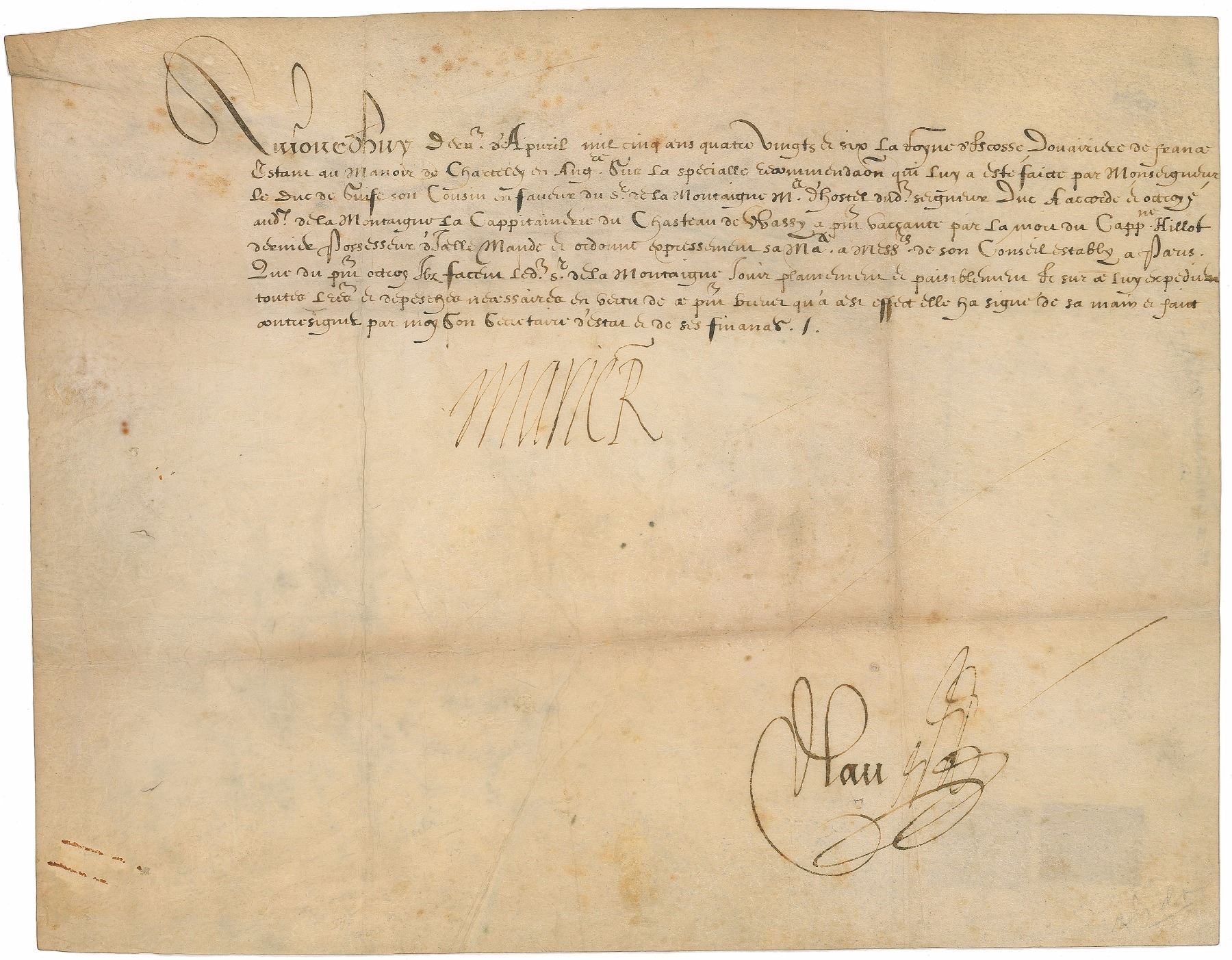 This document dates to near the end of Mary's life while she was imprisoned at Chartley Castle in Staffordshire by her cousin, Queen Elizabeth I of England. In 1560, Mary had been granted the right to the profits of Wassy, located in eastern Champagne, France, as part of her jointure as widow of the recently deceased French King Francis II, and the rights were being managed on her behalf by her uncle Francis, Duke of Guise. In 1562, Wassy was the site of a notorious massacre of Huguenots by troops under Francis, and sparked the bloody French Wars of Religion. At the time of the massacre, the recipient of this grant, Jacques de la Montaigne, was a resident of Wassy and the duke's maitre d'hotel-he was undoubtedly present at the massacre and is described in one source as its 'author and solicitor.' Francis was assassinated in 1563, and his son Henry succeeded him as Duke of Guise, as this document indicates. Just four months after signing this document, Mary was implicated in the Babington Plot to assassinate Queen Elizabeth and assume her place on the English throne-for her complicity in the scheme, Mary, Queen of Scots, was put to death on February 8, 1587.