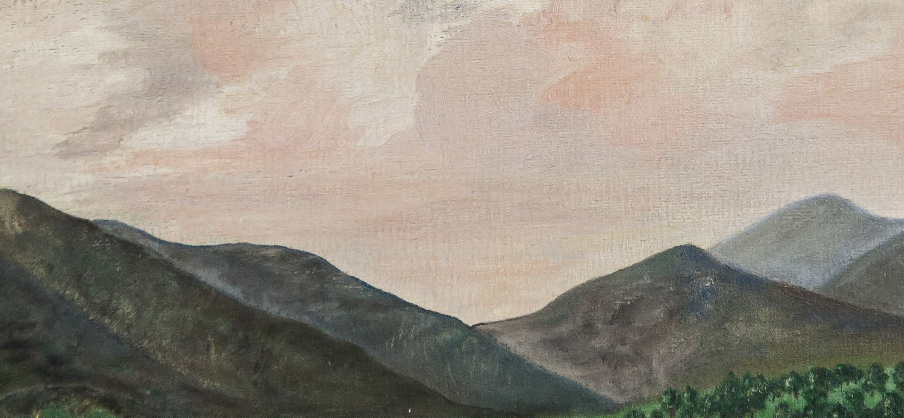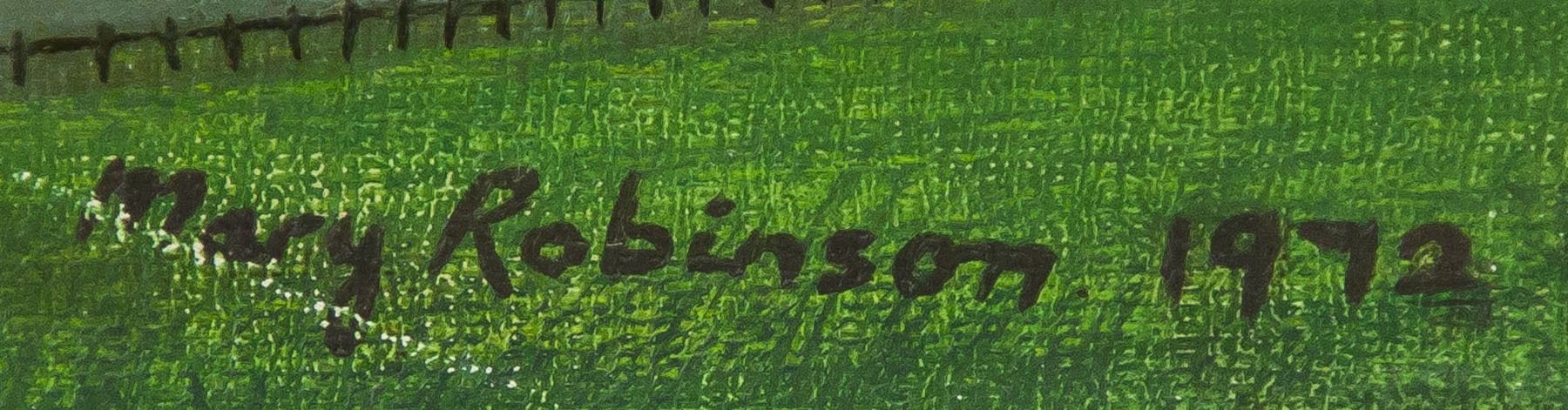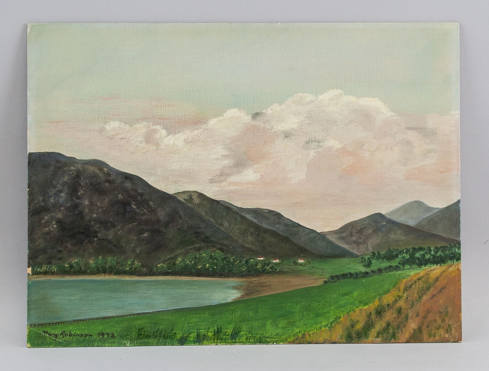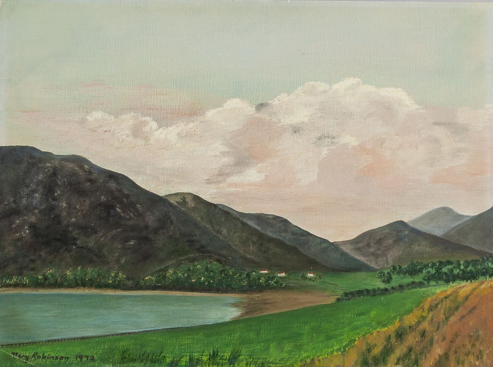 Oil on board. Featuring a landscape scene. Signed Mary Robinson and dated 1972 on the lower left corner. Inscribed LOCH LINNHE AND ARDCOUR MOUNTAINS CO ARGYLL / SEPT. 1971 on verso. Inscribed BT in red ink on verso. 30 x 40 cm (11.8 x 15.8 inches).