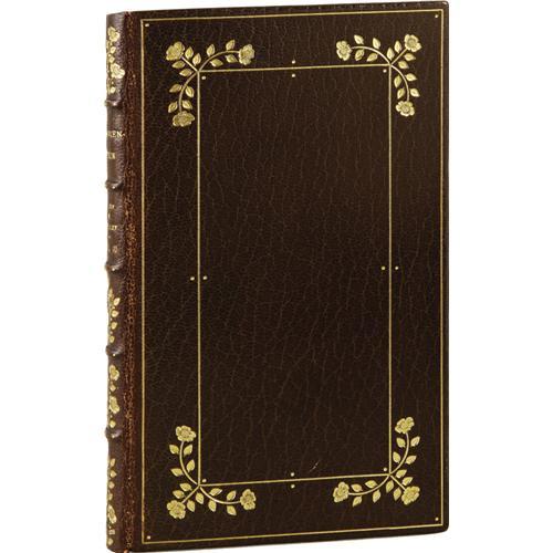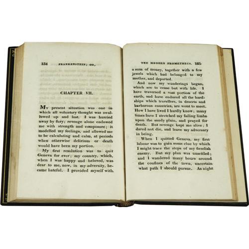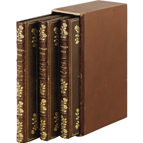 <B>Mary Wollstonecraft Shelley: <I>Frankenstein; or, The Modern Prometheus</B></I></B></I> <B>1818 First Edition.</B></I> (London: for Lackington, Hughes, Harding, Mavor & Jones, 1818), first edition, three volumes, 12mo (4.25" x 7"), bound in contemporary brown morocco with five raised bands, floral gilt decoration on the spines and front and back covers; front and back pastedown in gold bordered green leather, facing front free endpaper and back free endpaper in blue moire taffeta, small green leather book plate on verso of front free endpaper with gold design and monogram, introduction written by Percy Bysshe Shelley.<BR><BR>A brief synopsis of the story:<BR><BR>A young Swiss medical student discovers the secret of animating lifeless matter by assembling body parts, and creates a monster which vows revenge on its creator after being rejected by society.<BR><BR>Mary Shelley modeled her life and works on her parents', William Godwin and Mary Wollstonecraft, belief in the power and responsibility of the individual to effect change. <I>Frankenstein</B></I> was written in response to a literary contest agreed upon by Mary and Percy Shelley, Lord Byron, and his physician, John Polidori, that each would write a terrifying tale. With Percy's encouragement, Mary's tale became a novel and her greatest treatise on this philosophy of enlightenment. The following discussion of the novel was informed by Betty Bennett's <I>Mary Wollstonecraft Shelley: An Introduction</B></I>.<BR><BR>Frankenstein, a wealthy, indulged young man whose acceptance of his society's norms leads him to want, like a monarch or a god, absolute power. To achieve this goal, Frankenstein pieces together a very unheroic-appearing Creature, who devolves from a state of natural goodness to one of crime and transgression.<BR><BR>For Mary Shelley, scientific experimentation served as a model for political experimentation, both offering the means to create a better world. Paving the way for future science fiction novels, Mary Shelley incorporates some of the most recent technological findings of her time, replacing the heavenly fire of the Prometheus myth with the spark of newly discovered electricity. The animation of the Creature was inspired and informed by the experiments in electricity and reanimation of Luigi Galvani (1737-98) and Alessandro Volta (1745-1827).<BR><BR>In the Greek myth, Prometheus' actions, like Christ's, result in redemptive suffering for humanity. Frankenstein's quest, conversely, is for the attainment of personal, godlike power rather than for society's advancement. Frankenstein's failure, which destroys the larger community, is a parable for the failure of the 19th-century socio-political structure to take responsibility-material and spiritual-for the greater populace. His transgression is not that he enters sacred realms, but that he fails to take responsibility for his own actions. <BR><BR>This modern, failed Prometheus reduces the "heroic" act to a mocking parody of enlightenment personified by the Creature. The Creature is the only character that fully understands and assumes responsibility for the horrors of his deeds, though he is incapable of restraining himself. This Rousseauian natural savage regresses from a condition of instinctual goodness to learned evil, mirroring a society based on power and fear. When the Creature educates himself, he embodies Shelley's revered values of reason, love and individual dignity. When he breaks from this model and emulates the power system prevalent in the early 19th century, he, like his creator, becomes both victim and perpetuator of that system.<BR><BR>The novel advances Mary Shelley's reformist ideology that power and unjust social conditions are more the work of man than of God and therefore can be changed. With her dark gothic tale, Mary Shelley holds up an unflattering mirror to an England driven by the emerging industrial age to convey a humanistic message of hope, reason and universal love.<BR><BR>The three volumes are very good, with a light .5" scratch on back cover of Volume III, front cover of Volume II has thin .5" light line following the natural crackling pattern of the leather, edges of spines lightly rubbed and crackled, but integrity of leather still strong, Volume I lacking advertising leaf, top edge of textblock is gilt, each volume has small stain at top edge of front of textblock and bottom of textblock at spine, 2" crease at right corner of title page of Volume II, Volume I is lightly foxed, while Volumes II and III have minimal foxing. Box lined with flannel, brown cloth outside with leather trim around opening, leather trim missing along bottom edge of box. <I>From the Betty Bennett Collection.</B></I><BR><BR><b>Shipping:</b> Books & Catalogs (<a target="_blank" href="http://www.heritageauctions.com/common/shipping.php">view shipping information</a>)