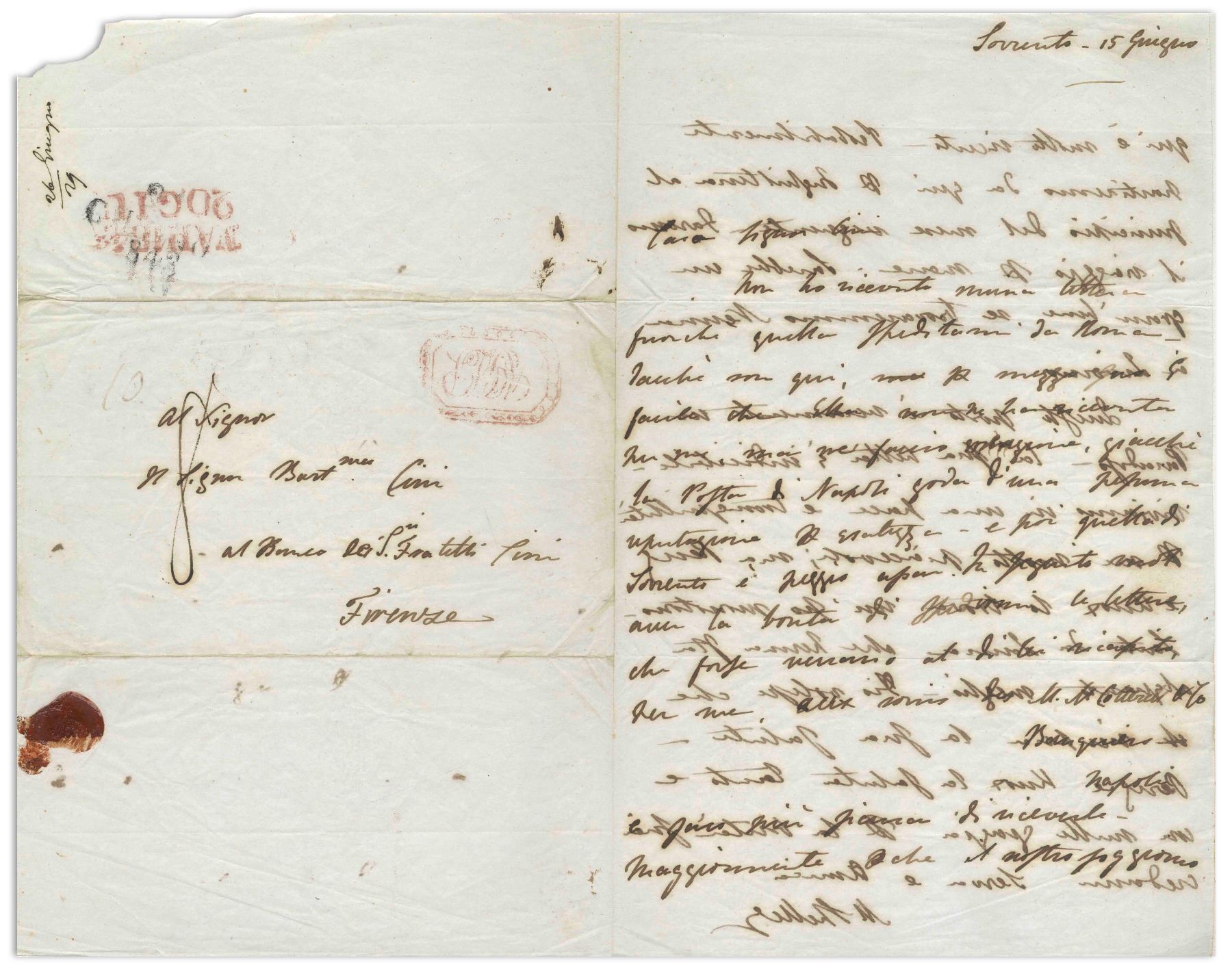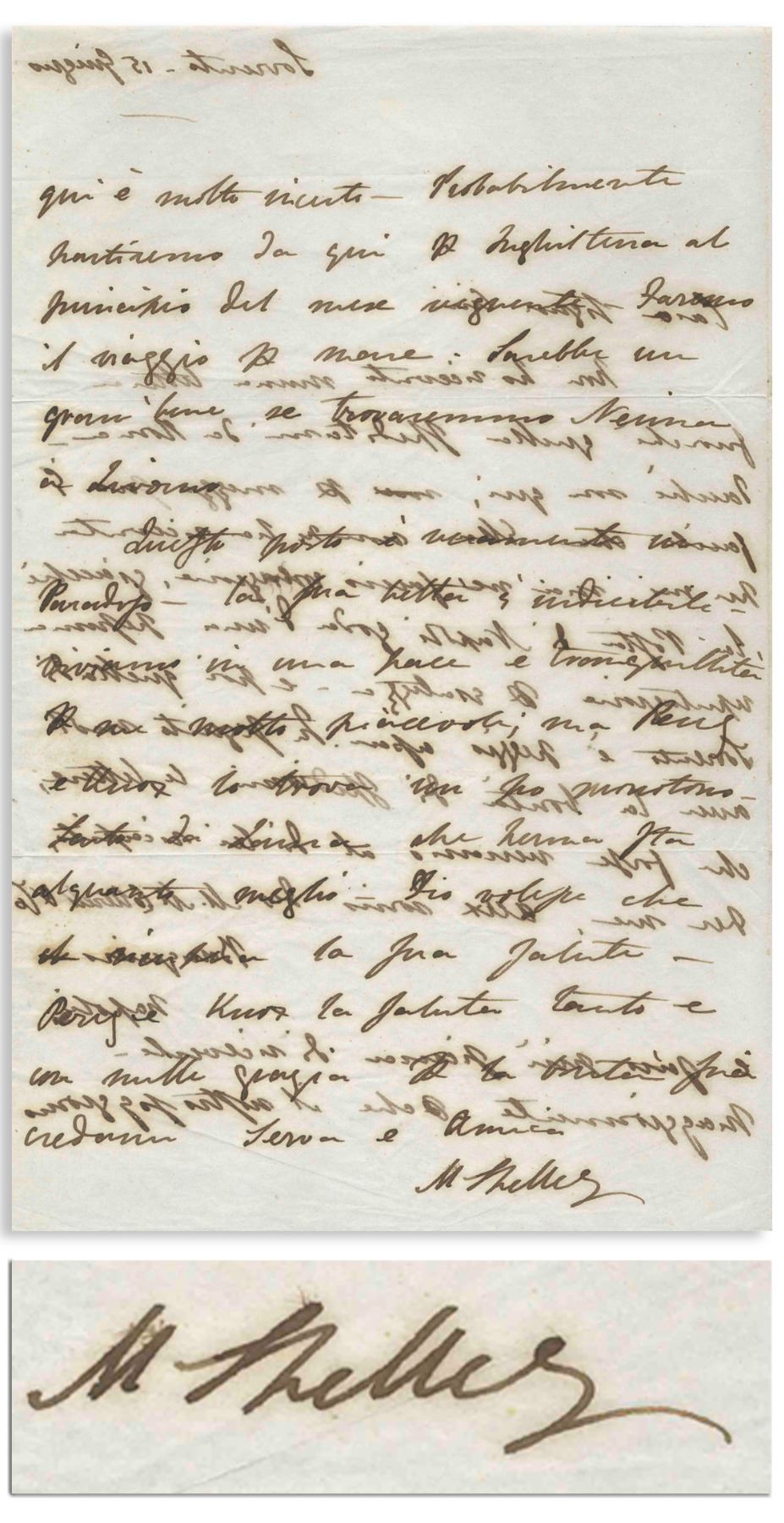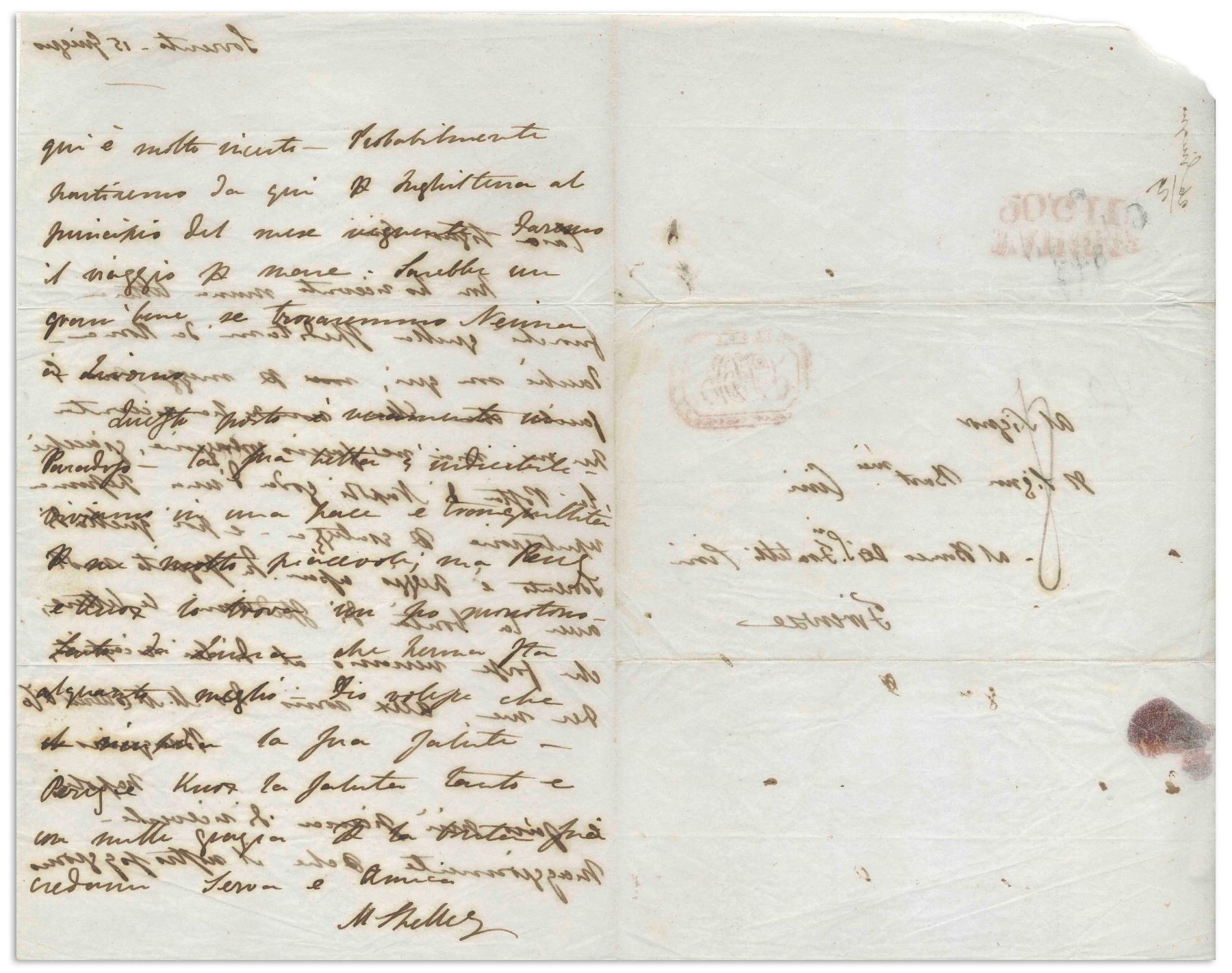 This place is truly a paradise, its beauty is indescribable. We live in a peace and tranquillity very pleasant to me, but Percy and Knox find it a bit monotonous. I hear from London that Nerina feels quite better. I pray God that she will regain her health. Percy and Knox send their best regards and many thanks for your kindness. / Please consider me your servant and friend. / M Shelley''. Shelley's travels through Europe with her son Percy formed the basis of her travelogue, ''Rambles in Germany and Italy in 1840, 1842 and 1843''. Three page letter on bifolium stationery measures 5.5'' x 8.5'' as folded, with address panel and red wax seal on verso. Chip to corner of last page, and some ink bleedthrough. Very good plus condition. With full translation.