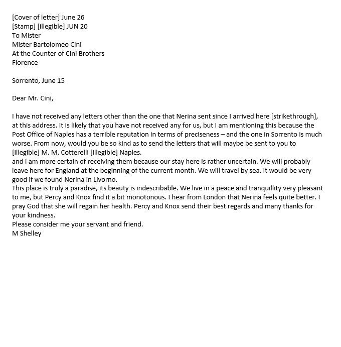 Mary Wollstonecraft Shelley autograph letter signed, dated Monday 15 June (likely 1843) from Sorrento during her travels through Italy. In this rare missive by the ''Frankenstein'' author, Shelley writes to the Italian nobleman Bartolomeo Cini regarding letters written by her late husband Percy Shelley to Cini's mother-in-law, the writer Margaret King Tighe, which Shelley was waiting to receive. Margaret King Tighe was a pupil of Shelley's mother, and the couple reacquainted themselves with her during their travels in Italy some 28 years prior.