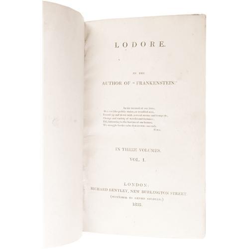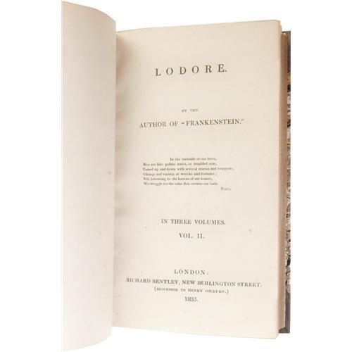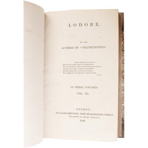 <B>Mary Shelley: <I>Lodore</B></I></B></I> <B>First Edition.</B></I> (London: Richard Bentley, 1835), first edition, three volumes, Volume I: 300 pages, Volume II: 297 pages, Volume III: 311 pages, rebound banded black half-leather with marbled boards, 12mo (4.75" x 7.25"). This set is about fine, with only very minor shelf wear to the corners, edges, and spines.<BR><BR><I>Lodore</B></I> dissects aristocratic values to demonstrate that ultimately they are detrimental to both the individual and society. In their stead, the novel proposes egalitarian educational paradigms for women and men, which would bring social justice as well as the spiritual and intellectual means by which to meet the life's many challenges. Although it was lost on reviewers, in the contemporary setting of the novel, the home becomes a paradigm for the state. The lives of its inhabitants are conditioned by familial and social education that conduct the individual either to a world of benevolence and mutual care or to one of conflict and mutual destruction. As with her other novels, reviewers of <I>Lodore,</B></I> by and large, ignored Mary Shelley's exploration of power and politics and confined her subject to the "secrets of the human heart." (From Betty Bennett's <I>Mary Wollstonecraft Shelley: An Introduction</B></I>).<BR><BR>Richard Garnett described <I>Lodore</B></I> as "remarkable for being…a veiled autobiography. The whole story of the hero and heroine's privations in London is a reminiscence of the winter of 1813. Harriet Shelley appears much idealized as Cornelia, and her sister's baneful influence over her is impersonated in the figure of a mother-in-law, Lady Santerre. By it Lodore is driven to America as Shelley to the continent. Emilia Viviani is also portrayed, probably with accuracy." <I>From the Betty Bennett Collection.</B></I><BR><BR><b>Shipping:</b> Books & Catalogs (<a target="_blank" href="http://www.heritageauctions.com/common/shipping.php">view shipping information</a>)