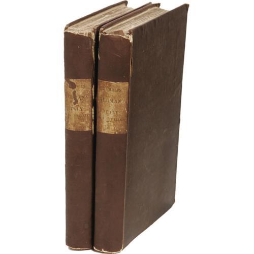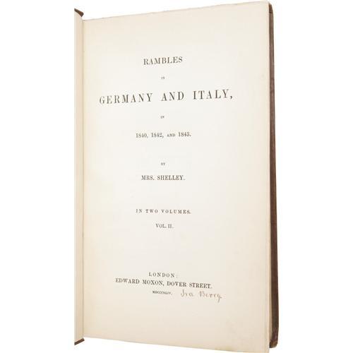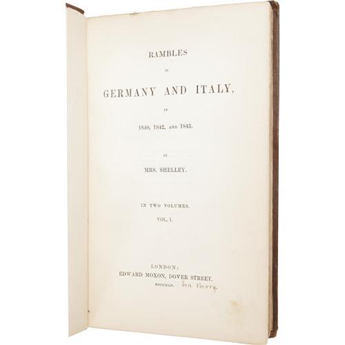 <B>Mary Shelley: <I>Rambles in Germany and Italy, in 1840, 1842, and 1843</B></I>.</B></I> (London: Edward Moxon, 1844), first edition, two volumes, Volume I: 280 pages, Volume II: 280 pages, brown cloth with title plates affixed to spine, 8vo (5.5" x 8"). <I>Rambles</B></I> is Mary Shelley's last full-length work. It is based on letters written during two extensive journeys she made with Percy Florence and several of his friends. In it, she blends Romantic values, female emancipation, and political advocacy. As a worldly and seasoned traveler, her narrative comments on war, national manners, historical perspectives, and political observations. Previous owner's signature on title page of each volume. Previous bookseller's price and notes on front pastedown of Volume I. Both volumes' front and back hinges cracked, head and tail of spine and label chipped, general soiling to brown cloth, and corners bumped. Textblock for each volume is clean. <I>From the Betty Bennett Collection.</B></I><BR><BR><b>Shipping:</b> Books & Catalogs (<a target="_blank" href="http://www.heritageauctions.com/common/shipping.php">view shipping information</a>)