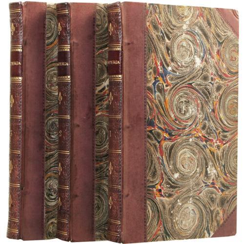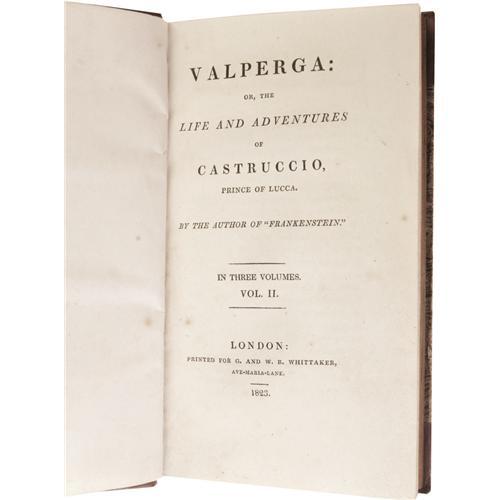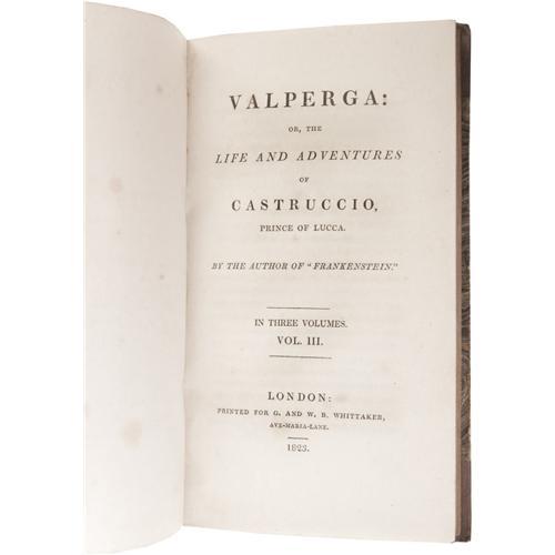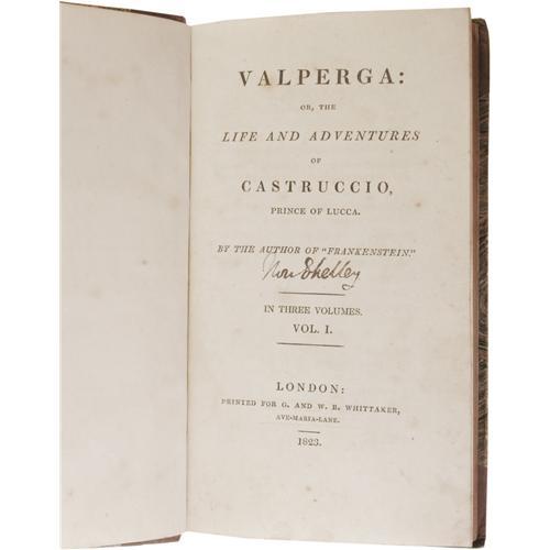 <B>Mary Shelley: <I>Valperga: or, The Life and Adventures of Castruccio, Prince of Lucca</B></I>.</B></I> (London: Printed for G. and W.B. Whittaker, Ave-Maria-Lane, by Richard Taylor, 1823), first edition, three volumes, Volume I: 293 pages, Volume II: 287 pages, Volume III: 269 pages followed by a leaf of publisher's advertising, brown half-leather and marbled boards with crimson and gilt title plate on spine, and gilt and blind stamping on spine as well, 12mo (4.25" x 7.25"). Edited by William Godwin. The set is in good condition, with general edge, corner and spine wear to each volume. Each volume has rubbed boards, light foxing, and previous owner's bookplate affixed to the front pastedown. Volume I shows bumping to the top corner of the boards. Volume II has front edge bumped. Both Volume II and Volume II have a vertical strip of matching marbled paper applied down the center of the back board. All three volumes have a tight textblock.<BR><BR><I>Valperga</B></I> is an intelligent study in sexual politics. It also contains some of Mary Shelley's most beautiful and impassioned writing. It was praised on publication for its convincing recreation of the period (Mary Shelley emulated Scott and foreshadowed George Eliot in the proficiency of her research and the portraits of its two female protagonists, though the heretic Beatrice shocked the Blackwood's reviewer). Yet, according to Mary Shelley, "it never had fair play" and, except for a facsimile, has never been republished.<BR><BR>Frederick L. Jones in <I>The Letters of Mary W. Shelley</B></I> writes, "Her creation of <I>Frankenstein</B></I> at the age of eighteen is a marvel known to many; but few if any are aware that <I>Valperga,</B></I> her second novel, excels the first almost as much as <I>Alastor</B></I> surpasses <I>Queen Mab.</B></I> It is, indeed, her best novel, having a richness of imaginative style and a creative force in combination with a thoroughness of scholarship that are exhibited in none of her other works. Shelley and Godwin enthusiastically recognized its advance beyond <I>Frankenstein,</B></I> and rightly expected great things of her in the future."<BR><BR>According to Betty Bennett in <I>Mary Wollstonecraft Shelley: An Introduction,</B></I> <I>Valperga</B></I> along with her other historical novel, <I>Perkin Warbeck,</B></I> voice in fiction Mary Shelley's opposition to monarchical government, disapproval of class distinction, abhorrence of slavery and war. During the era in which Mary Shelley wrote <I>Valperga,</B></I> the United States was the only operative federal democracy. Throughout Europe, monarchy was again in control. In the concept of historical cycles, both Shelleys saw the possibility of reform that could lead the way to enlightened sociopolitical systems. The different, yet related, characters of the women, resonating with Mary Wollstonecraft's arguments for equal rights for women, are the key to that reform. One reason <I>Valperga</B></I> never achieved the popularity that she, P. B. Shelley, and Godwin expected was that though the reviews were largely positive, they omitted discussion of <I>Valperga's</B></I> central political focus. Reviewers admired the female protagonist as the epitome of feminine virtue rather than as an unconventional political woman. We may only grasp <I>Valperga</B></I>'s significance if it is recognized to be about the politics of power contrasted with the power of love.<BR><BR><I>Valperga</B></I> was published February 19, 1823, just less than a month after P. B. Shelley's ashes were interred in the Protestant Cemetery in Rome. <I>From the Betty Bennett Collection.</B></I><BR><BR><b>Shipping:</b> Books & Catalogs (<a target="_blank" href="http://www.heritageauctions.com/common/shipping.php">view shipping information</a>)
