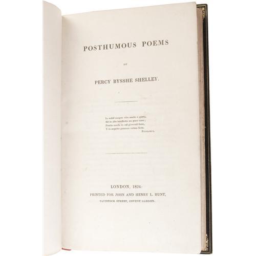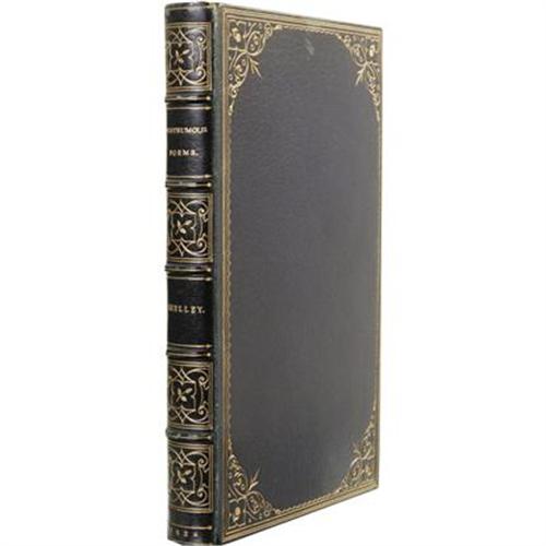 <B>Mary Shelley (Editor): <I>Posthumous Poems of Percy Bysshe Shelley</B></I>.</B></I> (London: Printed for John and Henry L. Hunt by C. H. Reynell, 1824), first edition, 413 pages, dark blue banded calf with gilt lettering on spine and gilt decoration on spine, boards, and edges of front and back pastedowns, marbled endpapers, top edge gilt, 8vo (5.5" x 8.75"). In the preface, Mary explains her decision to include incomplete poems, translations and poems out of print, in many instances deciphering drafts and putting together "fragments of paper which in the hands of an indifferent person would never have been deciphered." To cultivate a new readership for P. B. Shelley, Mary decided that this first of her editions of his works would be "a specimen of how he could write without shocking any one-and afterwards an edition of the whole might be got up inserting any thing too shocking for this Vol." In other words, <I>Posthumous Poems</B></I> was a conscious initial act of public persuasion, much as a number of the prefaces to both Percy's and Mary's works ambiguously veil the radicalism of the work itself to draw in a resistant audience.<BR><BR>500 copies of the first edition were printed and more than 300 copies were sold in two months time. <I>Posthumous Poems</B></I> has been credited with "the steady rise of interest in Shelley's poetry during the following years." Percy's father, Sir Timothy Shelley, however, demanded the suppression of the unsold copies and Mary's promise not to publish any more of his son's works during Sir Timothy's lifetime as requisite for the repayable allowance for Percy Florence's support. She resumed publishing P. B. Shelley's works 15 years later when Sir Timothy died. This copy is very good, with a .5" x .25" scuff at top center of front board, rubbing at the front and back of head of spine, and bottom edge of boards. Pencil notations on front flyleaf. Textblock is clean and tight. <I>From the Betty Bennett Collection.</B></I><BR><BR><b>Shipping:</b> Books & Catalogs (<a target="_blank" href="http://www.heritageauctions.com/common/shipping.php">view shipping information</a>)