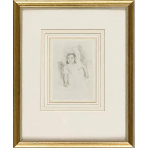 <B>MARY STEVENSON CASSATT (American, 1844-1926)</B></I><BR><I>Jeanette Wearing a Bonnet, No. 3</B></I>, 1904<BR>Drypoint<BR>9 x 6-1/4 inches (22.9 x 15.9 cm)<BR> <BR>LITERATURE:<BR>Adelyn Dohme Breeskin, Catalogue raisonne, #113<BR><B>Condition Report:</B> Normal wear commensurate with age, some mat burnning; not examined outside the frame.<BR><BR><b>Shipping:</b> Requires 3rd Party Shipping (<a target="_blank" href="http://www.heritageauctions.com/common/shipping.php">view shipping information</a>)
