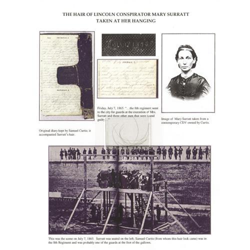 <B>Mary Surratt: A Lock of Hair from this Lincoln Assassination Conspirator, Taken at her Hanging.</B></I> Approximately a dozen hair, taken on the day of her execution by Samuel Curtis a soldier in the 8th Regiment which guarded the prisoners. Accompanied by detailed history and a certificate of authenticity from University Archives, Westport, Connecticut. <BR><BR><B>Important notice: