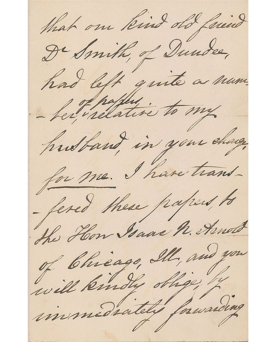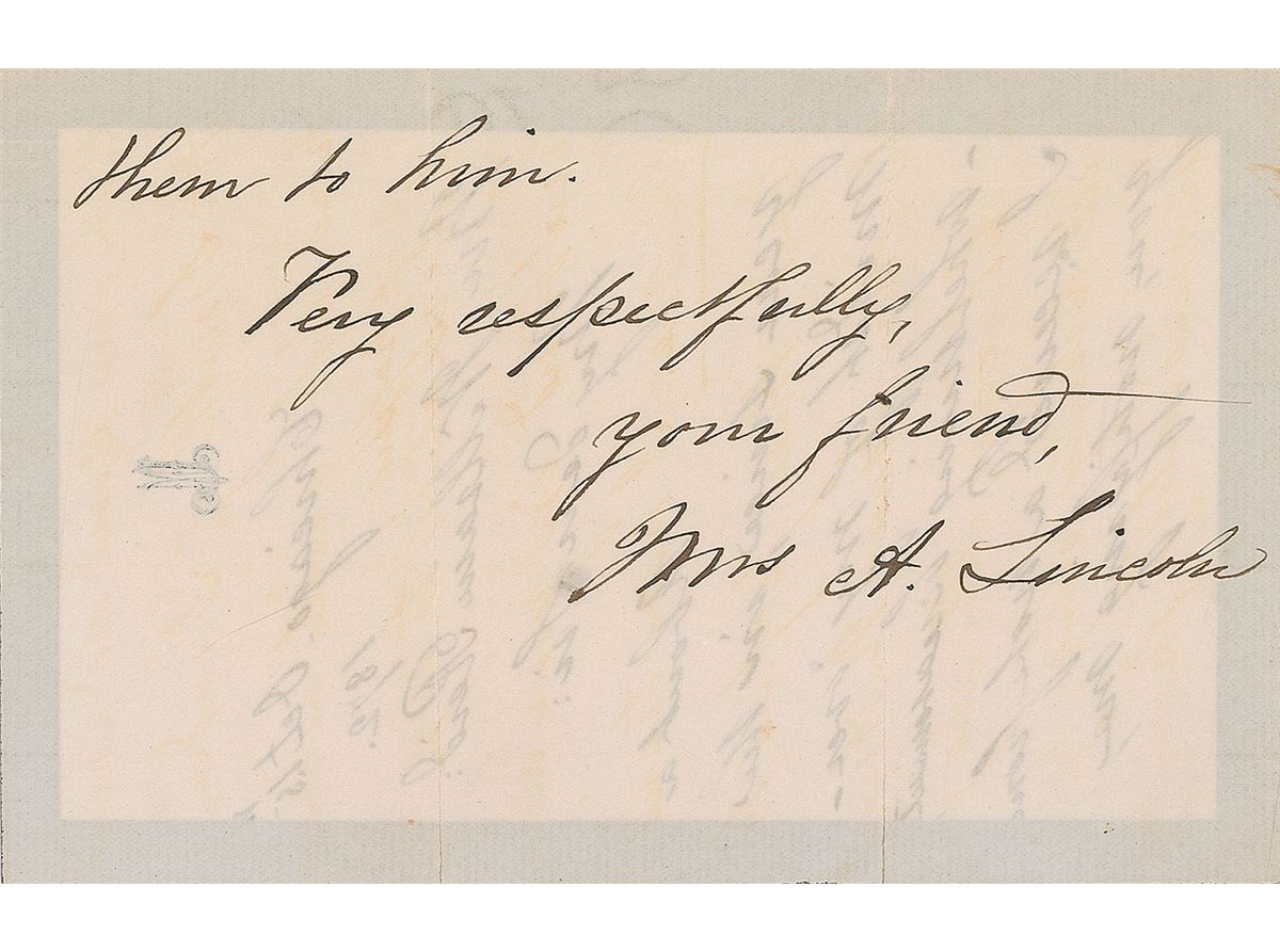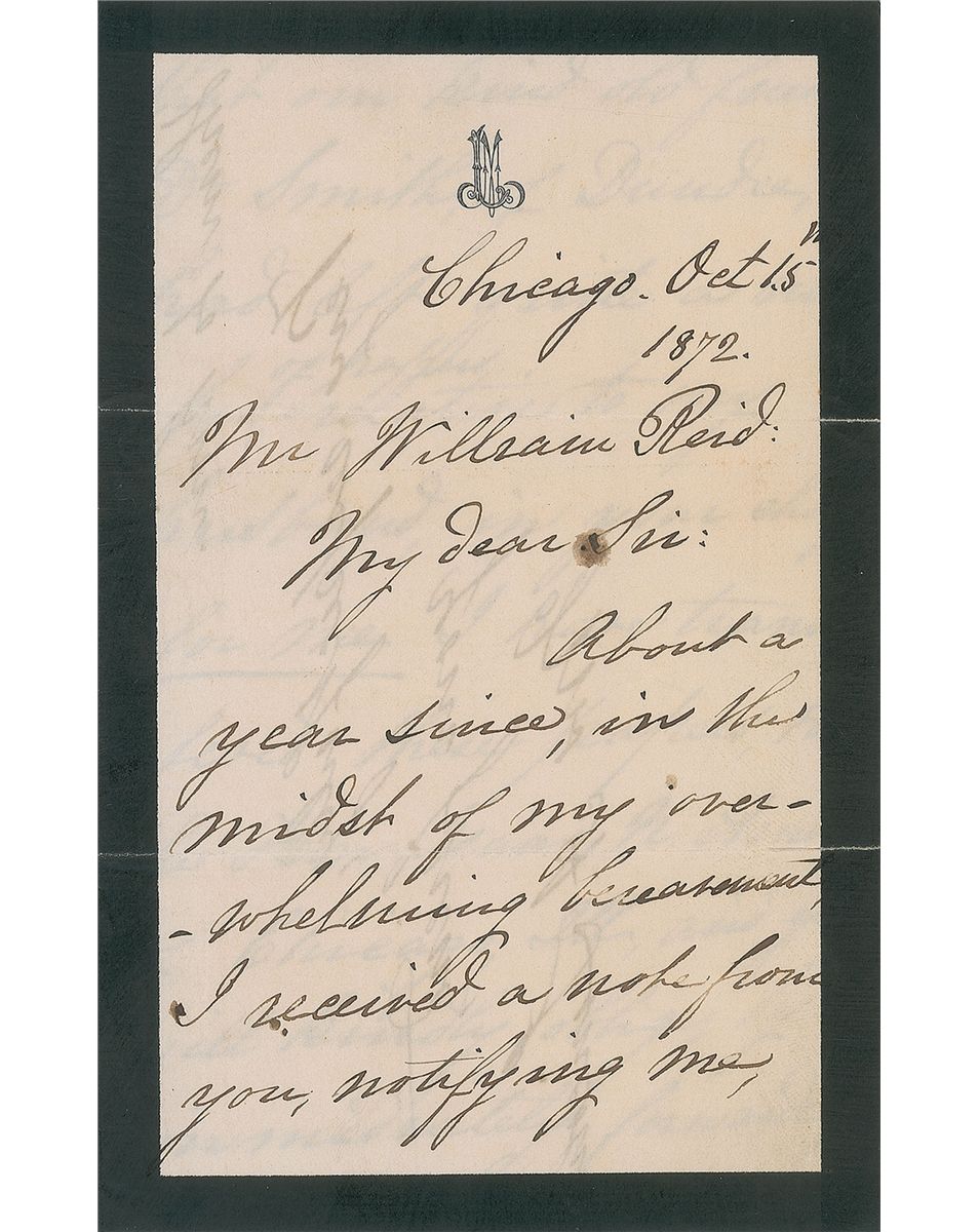 Wife of President Abraham Lincoln (1818-1882) and First Lady from 1861 to 1865. ALS signed “Mrs. A. Lincoln,” three pages on two adjoining sheets, 4.5 x 7, black-bordered personal letterhead, October 15, 1872. Letter to William Reid. In full: “About a yea