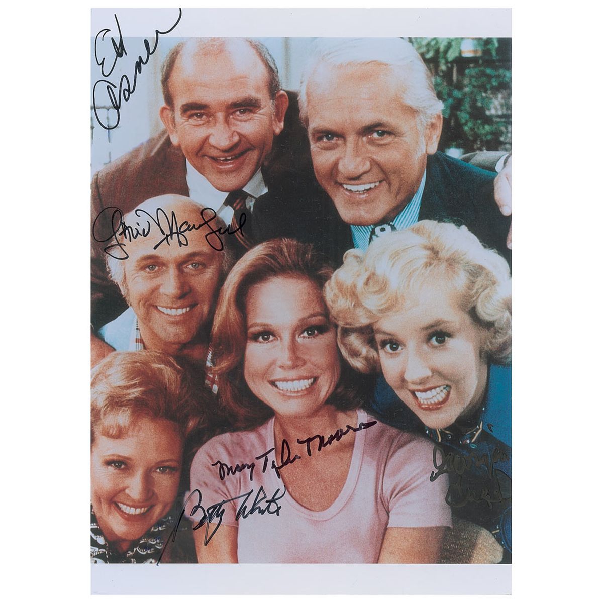 Color glossy 11 x 14 cast photo, signed in black felt tip by Mary Tyler Moore, Ed Asner, Gavin MacLeod, Betty White, and Georgia Engel. In fine condition, with some scattered light creases and surface marks.