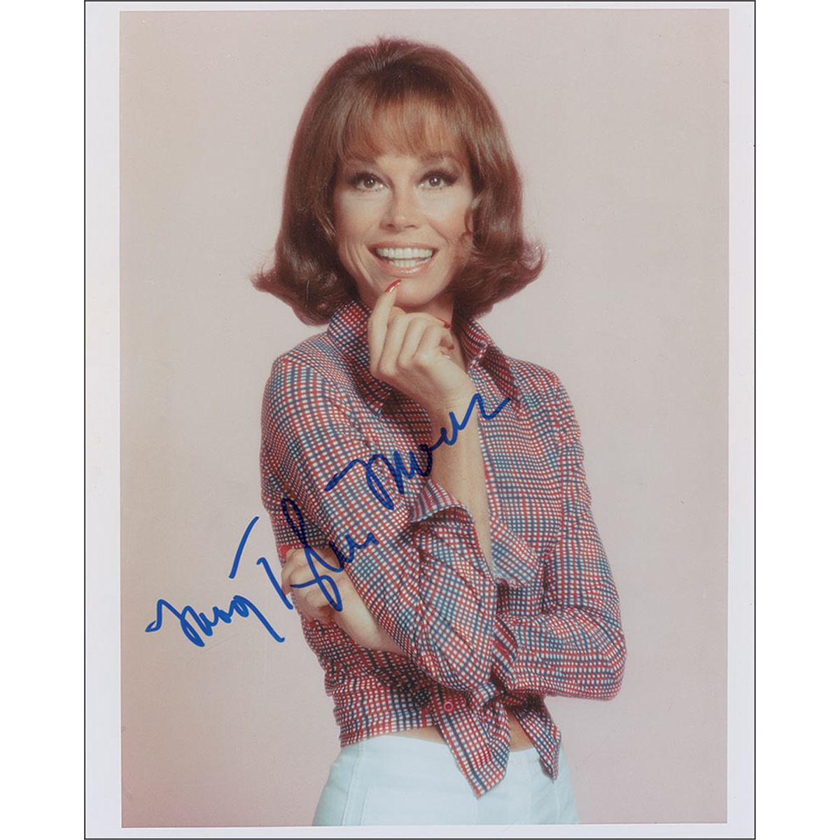 Uncommon color glossy 8 x 10 photo, signed in blue felt tip. In fine condition, with a few minor bends and creases.