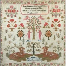 Mary Westoby, her needlework sampler worked in the early 19th century with a verse above 'Adam' and.