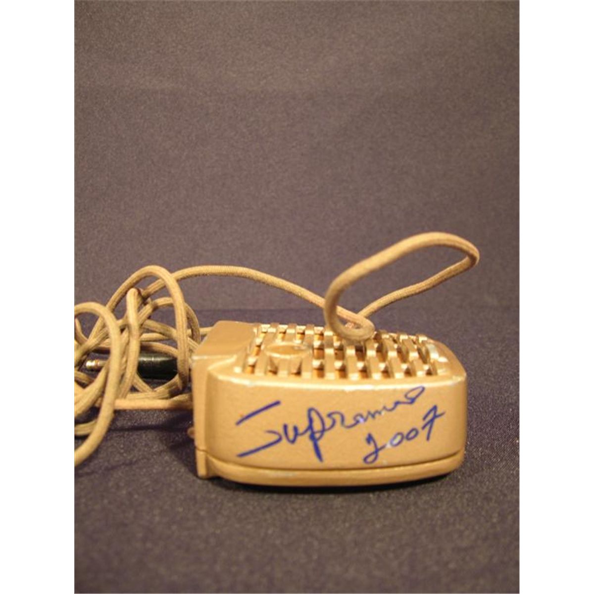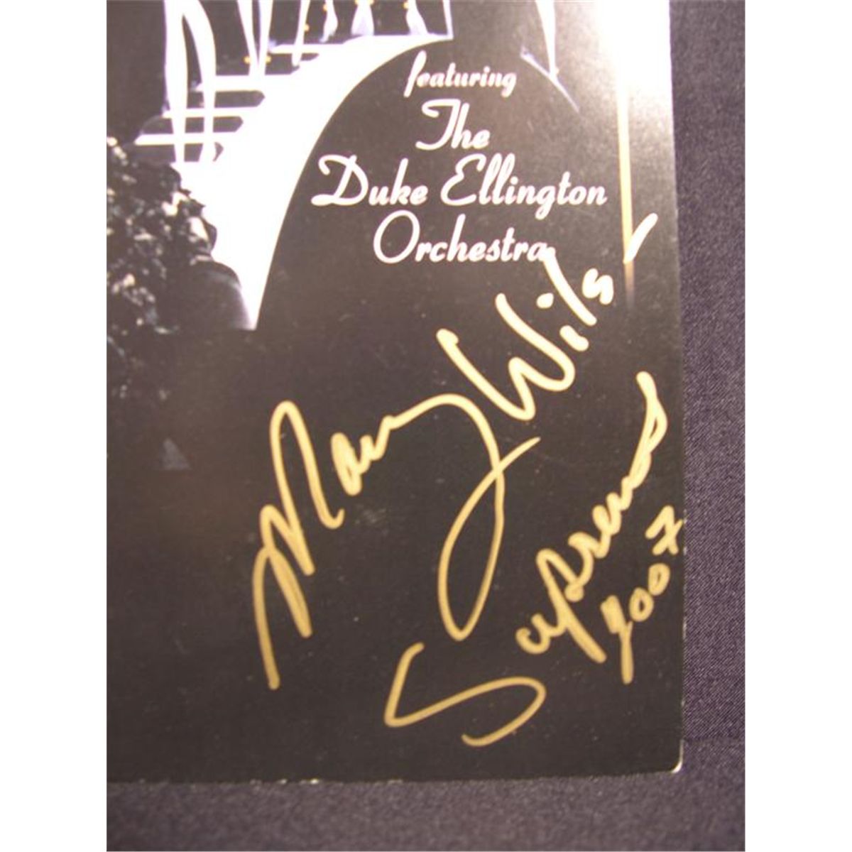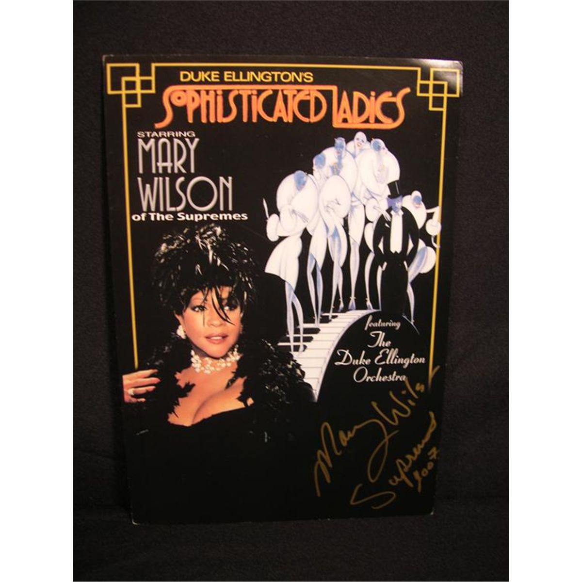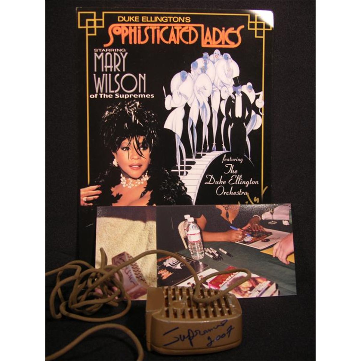 Color advertisement for Duke Ellington's Sophisticated Ladies, signed in gold ink by Mary Wilson of The Supremes. She has added "Supremes, 2007" to her signature. This lot further includes a vintage 1960s mircophone which has been signed by Wilson, again adding "The Supremes, 2007". Includes photos of Wilson signing both items. (12x8.5)