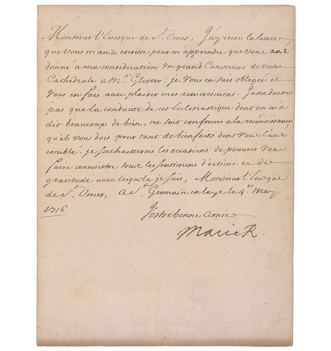 Queen consort of King James II of England and VII of Scotland. When James died on September 6, 1701, Mary succeeded in inducing Louis to recognize her son as king of England and Scotland, an act that accelerated English participation in the War of the Spanish Succession. LS in French, signed “Marie R,” one page, 6.75 x 8.75, May 4, 1716. Untranslated letter to the Bishop of St. Omer, thanking him for having donated a large canonicat to a mutual friend, which she believes will do much good. In fine condition, with intersecting folds (one vertical fold passing through a single letter of the signature), and mild scattered foxing and toning.