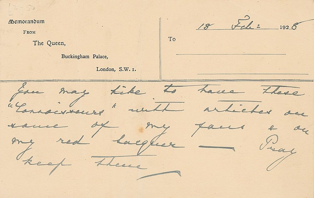 Unsigned autograph memo, one page, 7 x 4.5, Queen’s memorandum letterhead, February 18, 1928. Brief memo. In part: “You may like to have these…articles…on my red lacquer.” In very good condition, with a couple vertical folds and scattered creases.