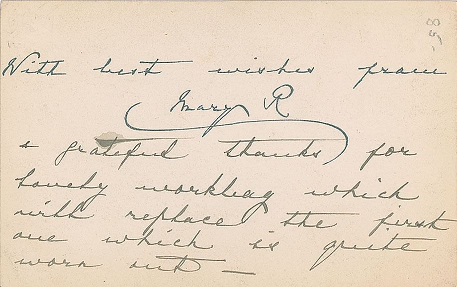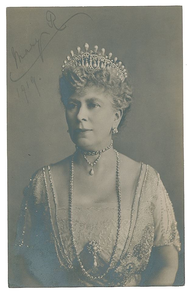 Vintage matte-finish 3.5 x 5.5 photo of Mary of Teck in her crown jewels, signed on the front in fountain pen, "Mary R, 1919," adding a note on the reverse below a pre-printed signature: "Grateful thanks for lovely workbag which will replace the first one which is quite worn out." In fine condition, with light silvering to some darker areas of the image.